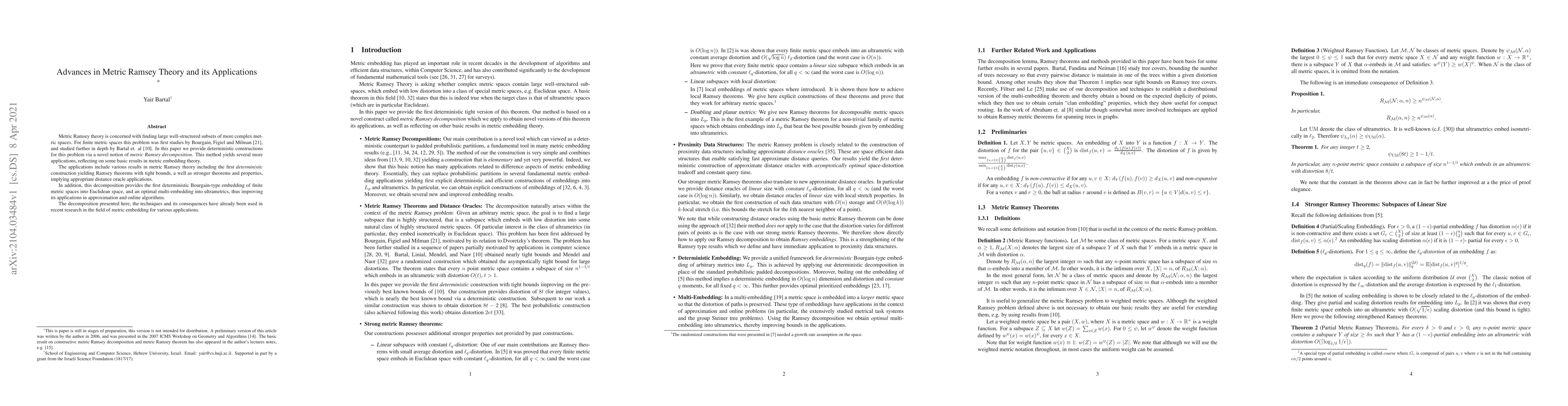 This paper introduces a novel deterministic method called metric Ramsey decomposition to construct large well-structured subsets in metric spaces, offering tight bounds and applications in metric embedding theory. It also provides the first deterministic Bourgain-type embedding into Euclidean space and optimal multi-embedding into ultrametrics, enhancing approximation and online algorithms.