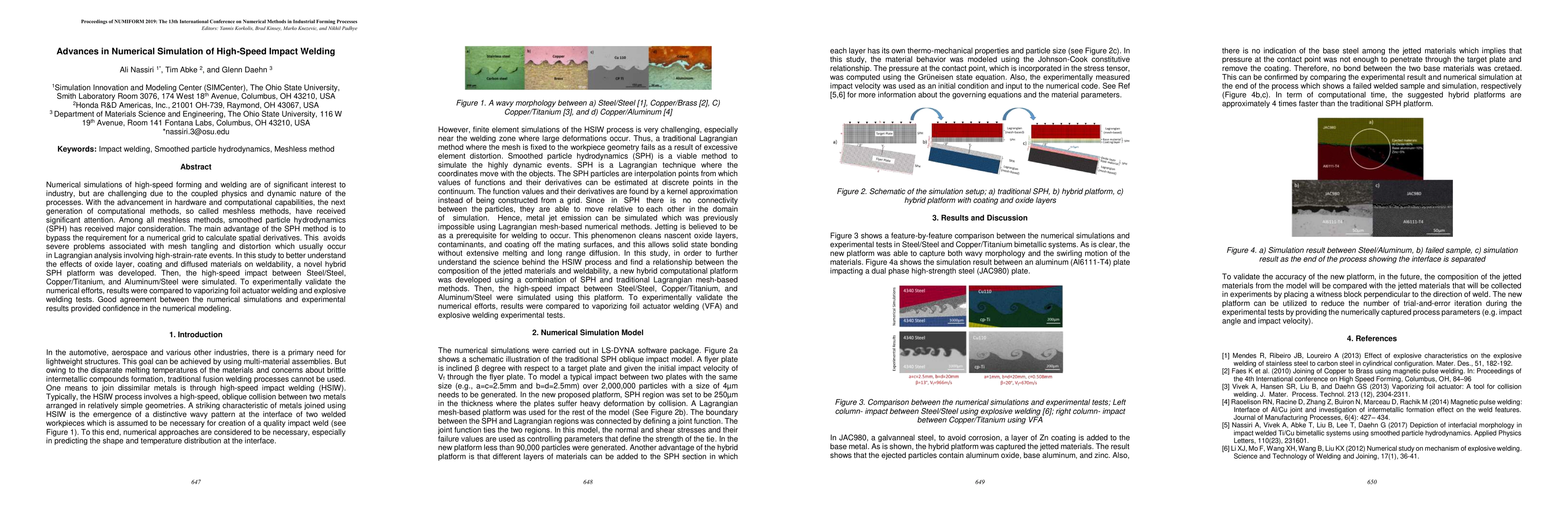 Researchers developed a novel hybrid smoothed particle hydrodynamics platform to simulate high-speed impact welding processes, achieving good agreement with experimental results in tests of Steel/Steel, Copper/Titanium, and Aluminum/Steel welds.