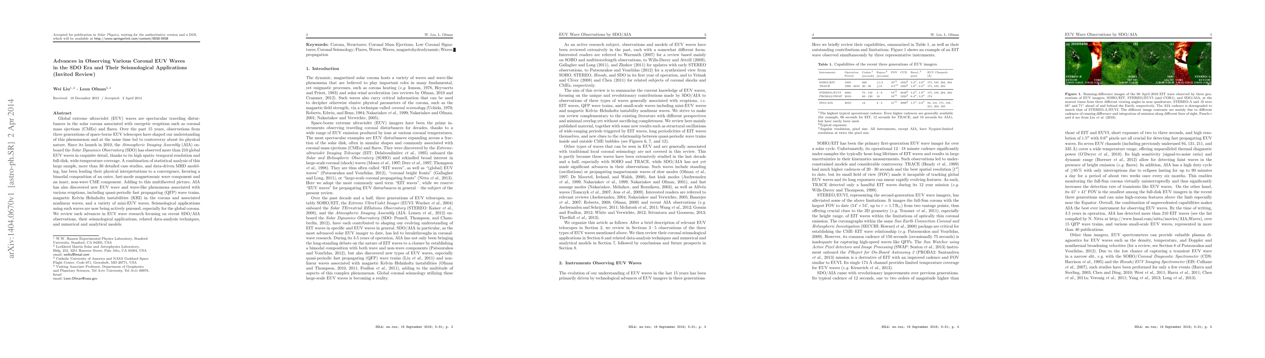 This paper reviews advances in observing global extreme ultraviolet (EUV) waves in the solar corona using the SDO/AIA, highlighting their bimodal nature and new wave phenomena. It discusses the seismological applications of these waves, supported by statistical analysis, case studies, and modeling, and explores their potential for understanding the global corona.