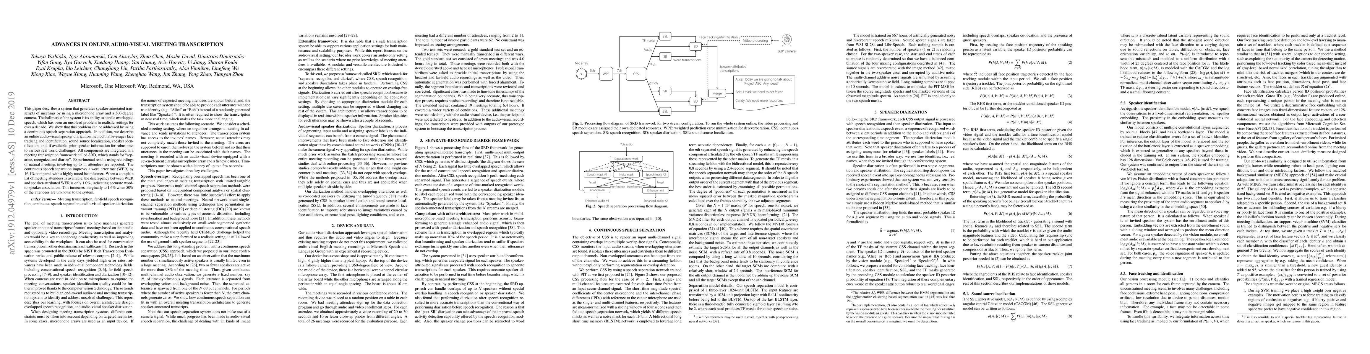 This paper presents a system that generates accurate speaker-annotated transcripts of online meetings using a microphone array and 360-degree camera, improving word error rates by up to 16%.