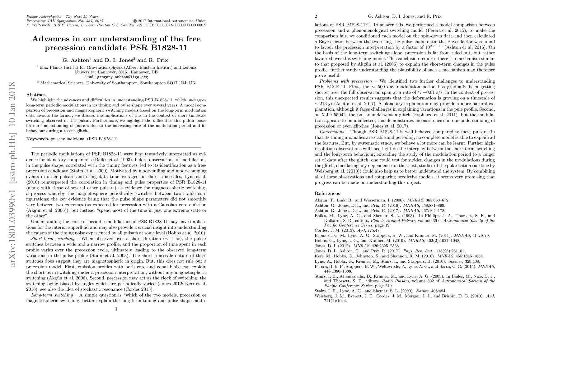 We highlight the advances and difficulties in understanding PSR B1828-11, which undergoes long-term periodic modulations in its timing and pulse shape over several years. A model comparison of precession and magnetospheric switching models based on the long-term modulation data favours the former; we discuss the implications of this in the context of short timescale switching observed in this pulsar. Furthermore, we highlight the difficulties this pulsar poses for our understanding of pulsars due to the increasing rate of the modulation period and its behaviour during a recent glitch.