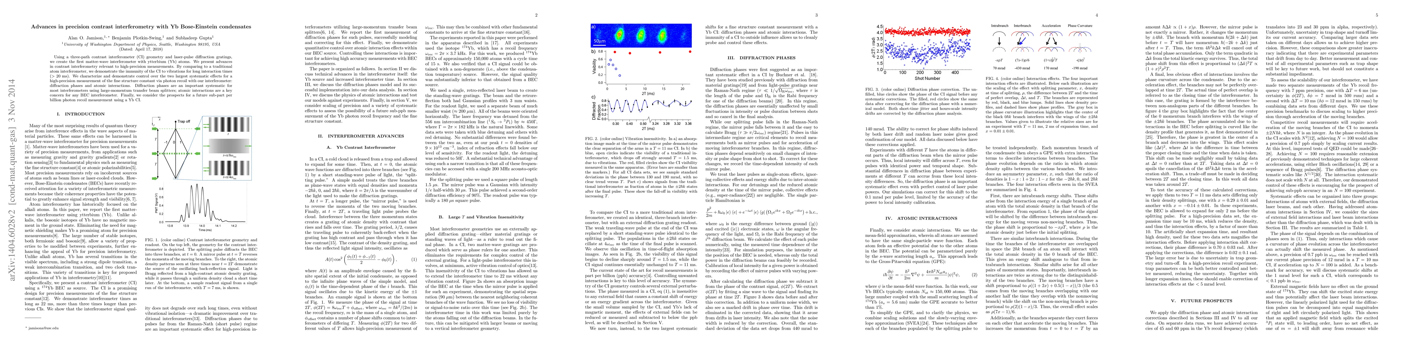 This paper introduces a novel matter-wave interferometer using Yb atoms and advances in precision contrast interferometry, demonstrating immunity to vibrations and control over systematic effects. It also explores the potential for high-precision measurements of the fine structure constant via photon recoil.