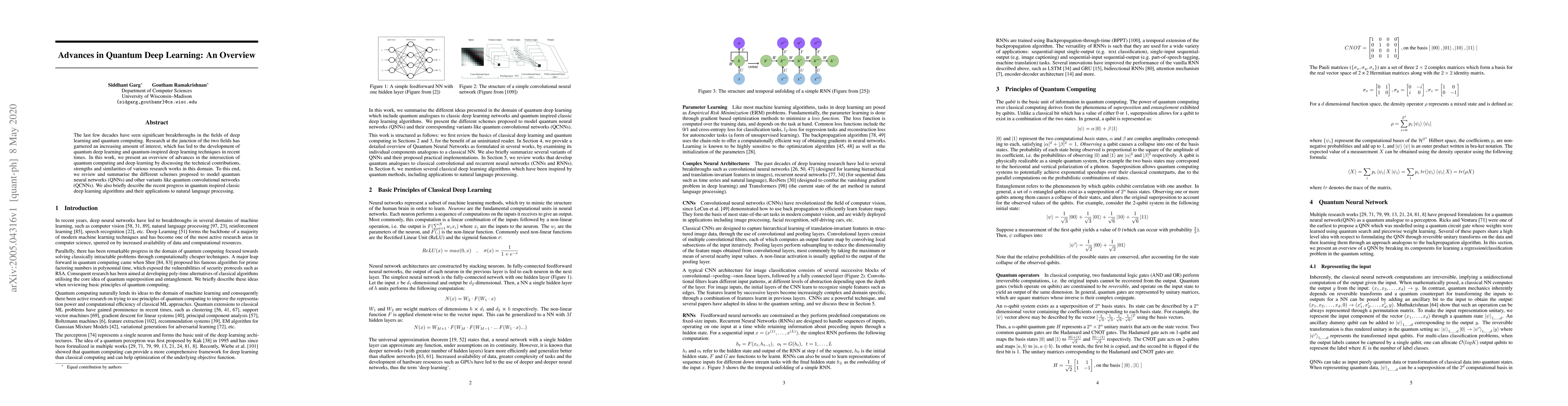 This paper provides an overview of recent advancements in quantum deep learning, summarizing technical contributions, strengths, and similarities of quantum neural networks and quantum convolutional networks. It also highlights the progress in quantum-inspired classical deep learning algorithms applied to natural language processing.