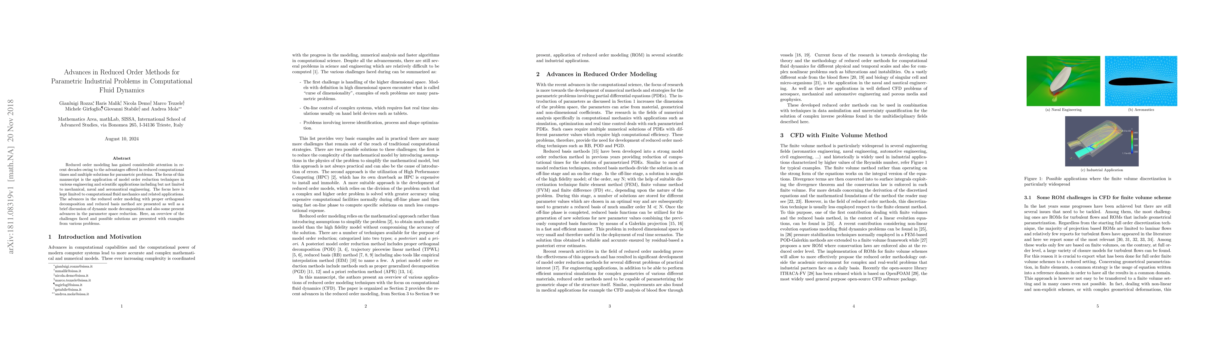 This paper reviews advances in reduced order modeling techniques for computational fluid dynamics, focusing on proper orthogonal decomposition and reduced basis methods. It discusses challenges in parametric problems and presents solutions with examples from mechanical, naval, and aeronautical engineering applications.