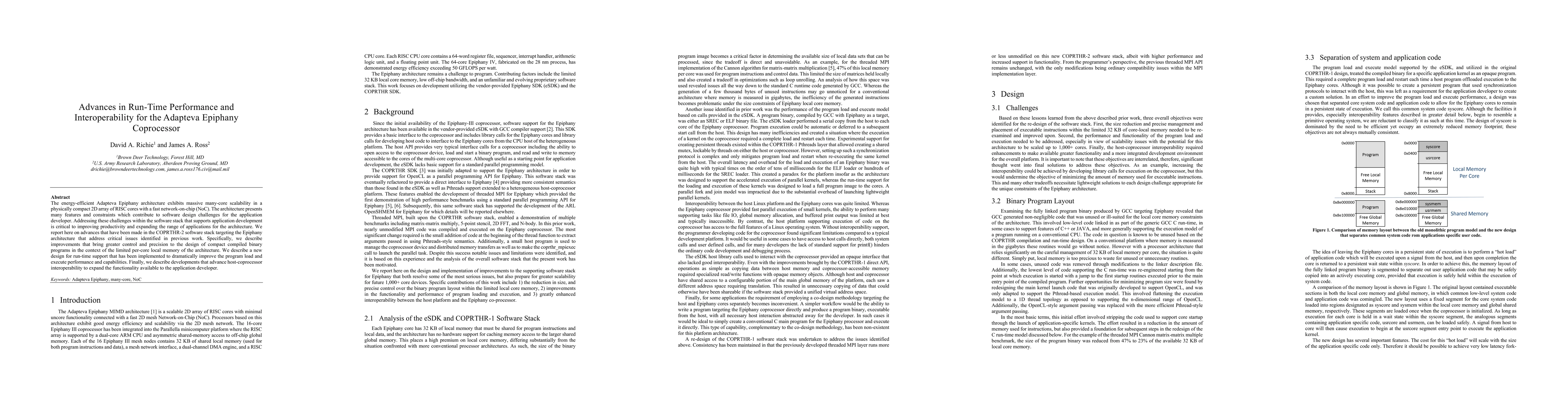 The energy-efficient Adapteva Epiphany architecture exhibits massive many-core scalability in a physically compact 2D array of RISC cores with a fast network-on-chip (NoC). The architecture presents many features and constraints which contribute to software design challenges for the application developer. Addressing these challenges within the software stack that supports application development is critical to improving productivity and expanding the range of applications for the architecture. We report here on advances that have been made in the COPRTHR-2 software stack targeting the Epiphany architecture that address critical issues identified in previous work. Specifically, we describe improvements that bring greater control and precision to the design of compact compiled binary programs in the context of the limited per-core local memory of the architecture. We describe a new design for run-time support that has been implemented to dramatically improve the program load and execute performance and capabilities. Finally, we describe developments that advance host-coprocessor interoperability to expand the functionality available to the application developer.