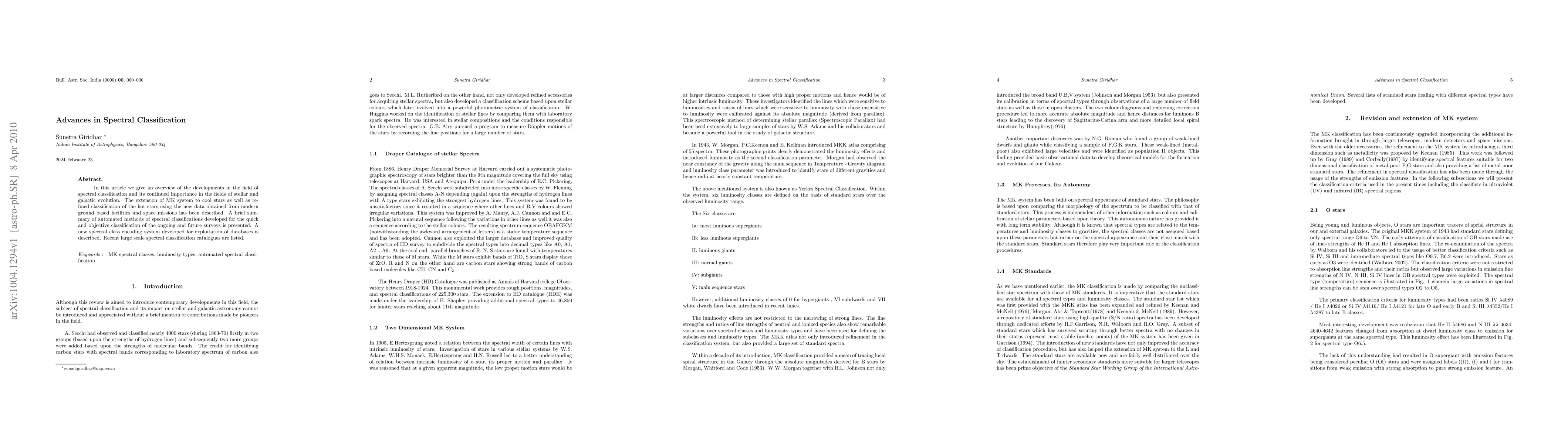 This paper reviews advancements in spectral classification, highlighting improvements in the MK system for cool stars and refined classifications for hot stars using modern data. It also discusses automated classification methods and a new spectral class encoding system for database exploitation.