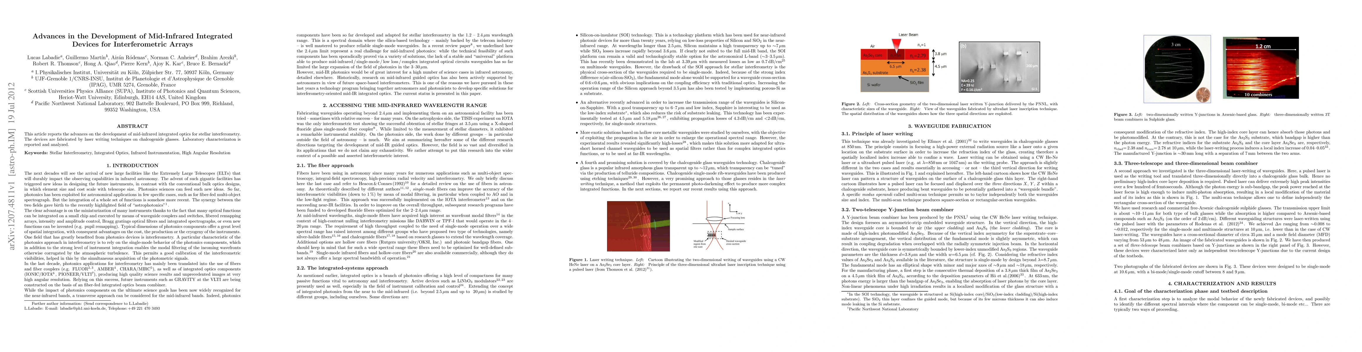 This paper discusses advancements in mid-infrared integrated optics for stellar interferometry, utilizing laser writing techniques on chalcogenide glasses, with detailed laboratory characterization and analysis of the fabricated devices.