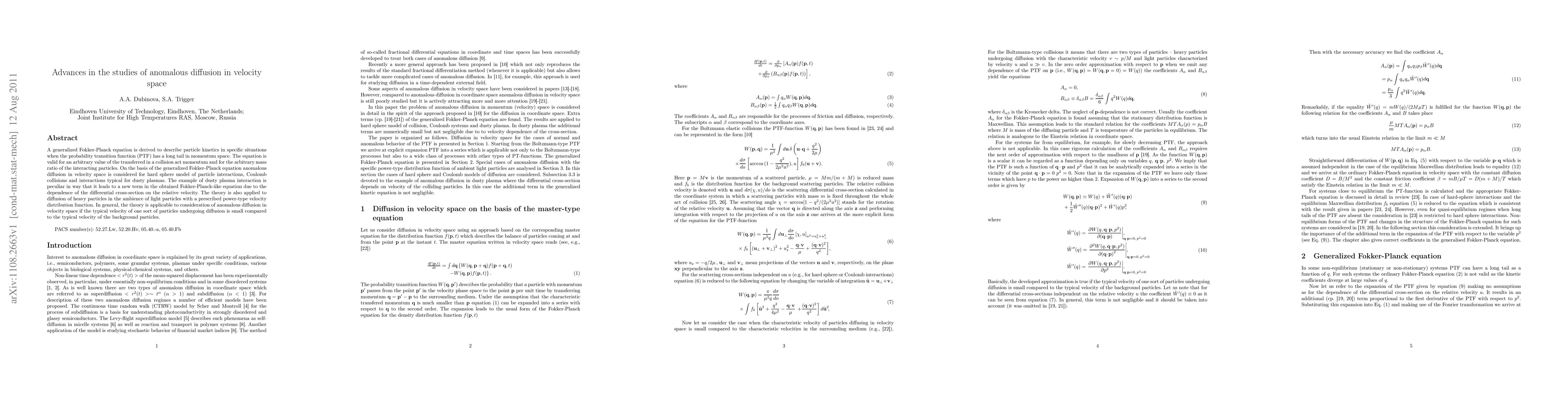 A generalized Fokker-Planck equation is derived to describe particle kinetics in specific situations when the probability transition function (PTF) has a long tail in momentum space. The equation is valid for an arbitrary value of the transferred in a collision act momentum and for the arbitrary mass ratio of the interacting particles. On the basis of the generalized Fokker-Planck equation anomalous diffusion in velocity space is considered for hard sphere model of particle interactions, Coulomb collisions and interactions typical for dusty plasmas. The example of dusty plasma interaction is peculiar in way that it leads to a new term in the obtained Fokker-Planck-iike equation due to the dependence of the differential cross-section on the relative velocity. The theory is also applied to diffusion of heavy particles in the ambience of light particles with a prescribed power-type velocity distribution function. In general, the theory is applicable to consideration of anomalous diffusion in velocity space if the typical velocity of one sort of particles undergoing diffusion is small compared to the typical velocity of the background particles.