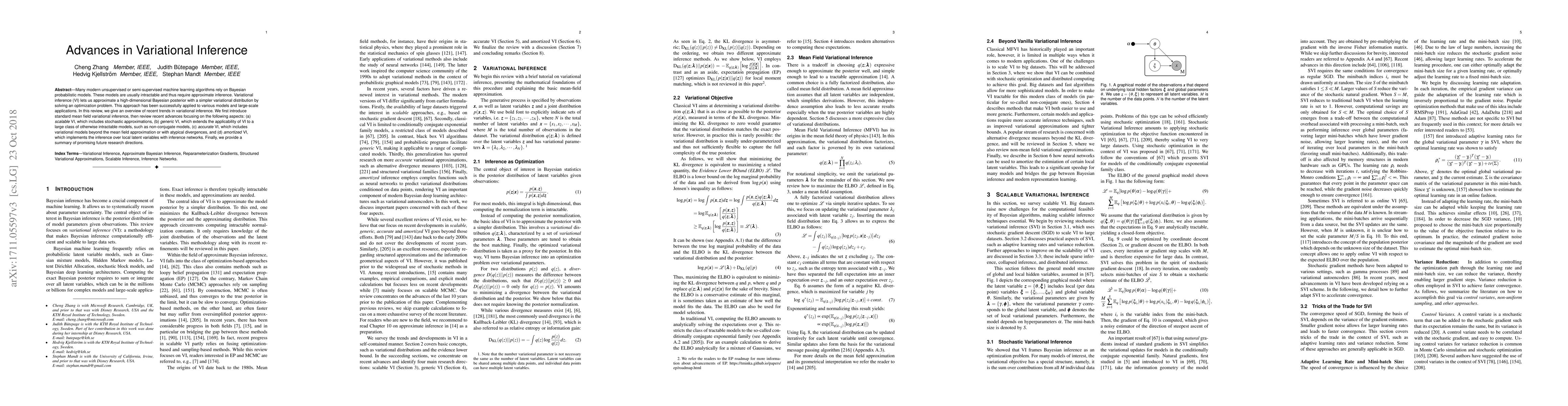 This review surveys recent advances in variational inference (VI), focusing on scalable VI, generic VI for non-conjugate models, accurate VI with alternative divergences, and amortized VI using inference networks. It highlights promising future research directions in the field.