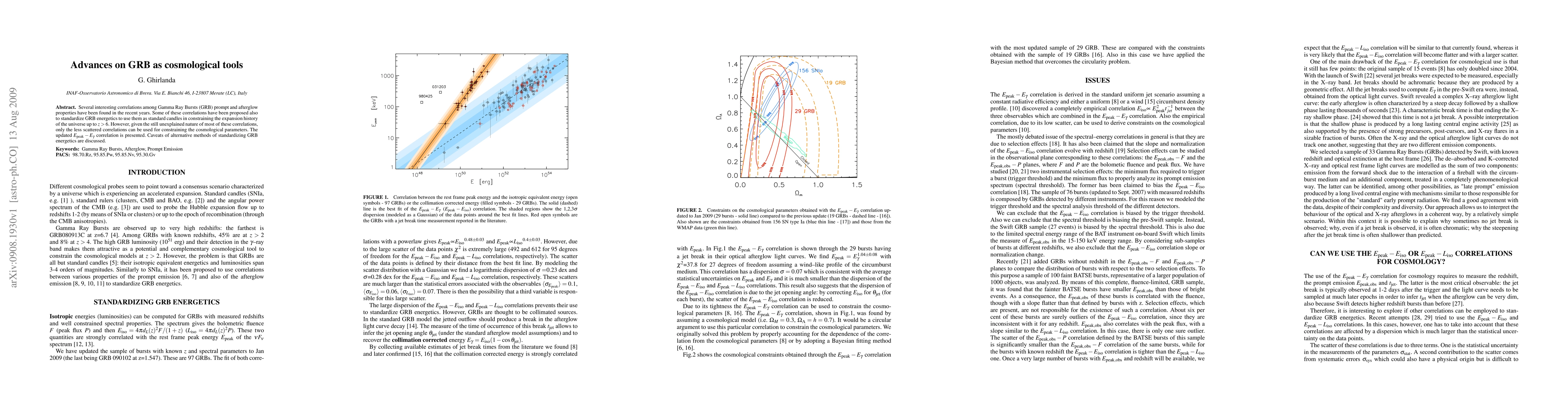 The paper discusses advancements in using Gamma Ray Bursts (GRB) as cosmological tools, highlighting recent correlations among GRB properties. It presents an updated E_peak-E_gamma correlation for standardizing GRB energetics, while cautioning about alternative methods. These correlations could potentially constrain cosmological parameters up to z>6, though only less scattered ones are currently viable due to unexplained nature of most correlations.