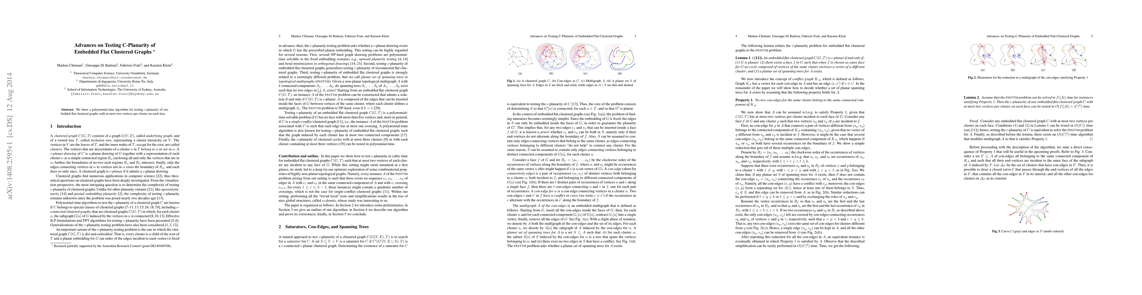 Summary: A polynomial-time algorithm is presented for determining c-planarity in embedded flat clustered graphs where each face contains no more than two vertices per cluster. This advancement aids in assessing the spatial arrangement of clustered graph elements.