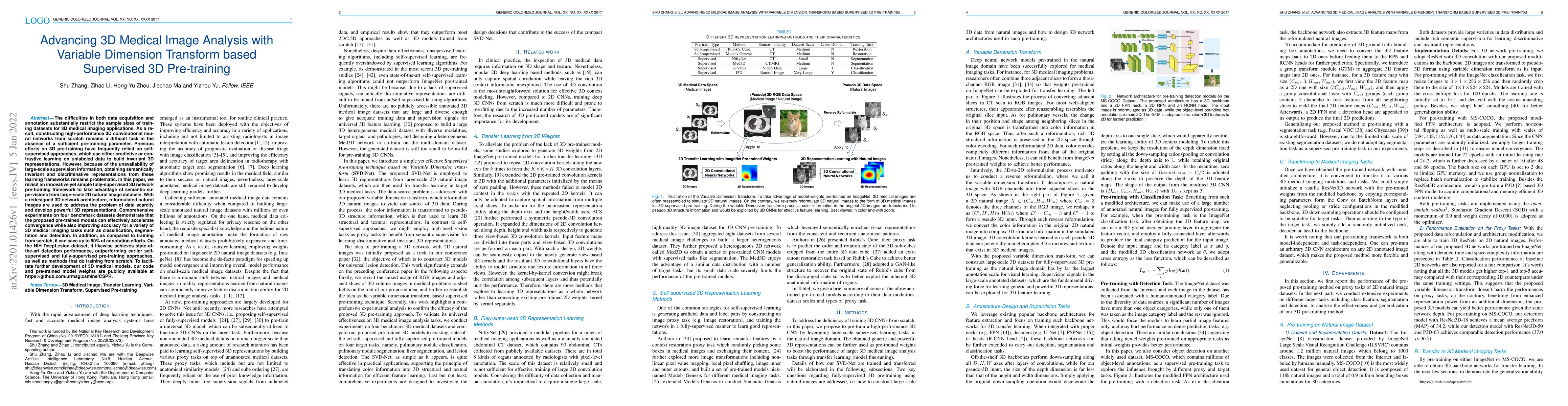 This paper proposes a supervised 3D pre-training framework leveraging variable dimension transform to address the scarcity of labeled 3D medical imaging data. By utilizing large-scale 2D natural image datasets, the method effectively accelerates model convergence and improves accuracy for tasks like classification, segmentation, and detection, saving up to 60% annotation effort.