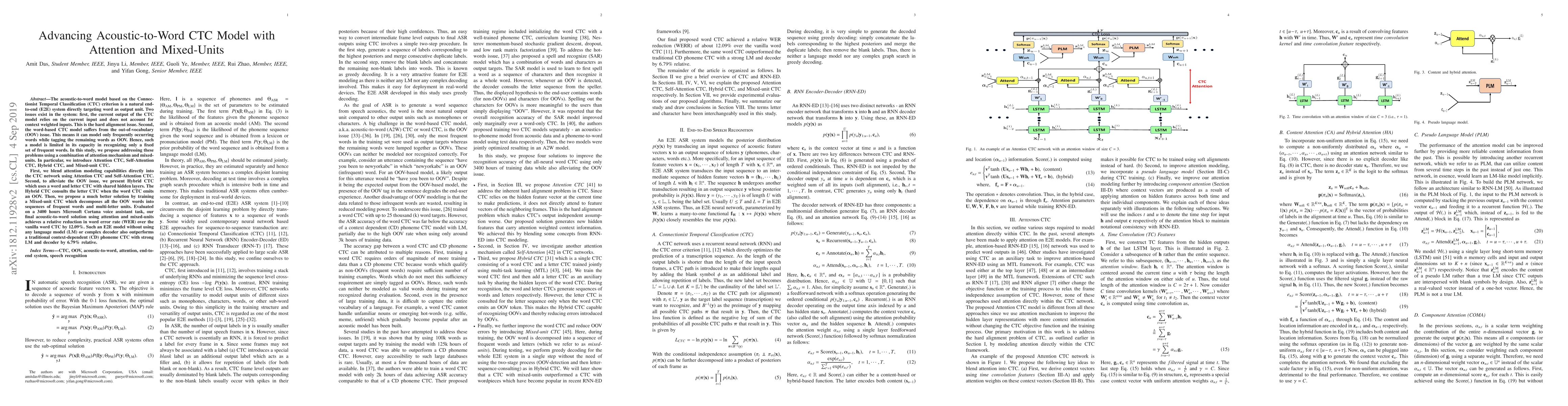 This paper proposes advanced acoustic-to-word models using Connectionist Temporal Classification (CTC) with attention and mixed-units to address the hard alignment and out-of-vocabulary issues. The proposed solutions, including Attention CTC, Self-Attention CTC, Hybrid CTC, and Mixed-unit CTC, achieve a 12.09% relative reduction in word error rate compared to the vanilla word CTC model.