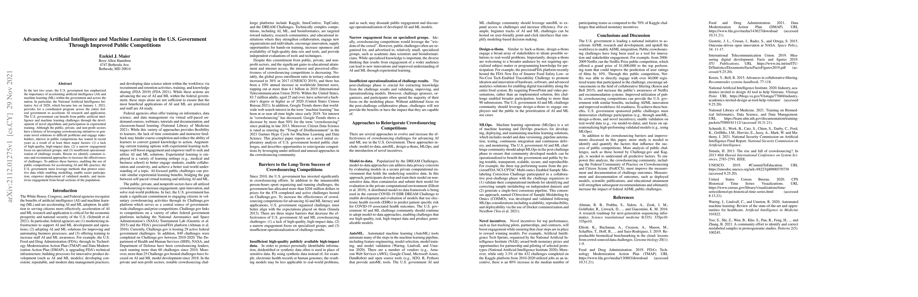 This paper discusses the U.S. government's efforts to accelerate AI and ML through public competitions, highlighting the decline in interest due to data quality issues, limited engagement, and inadequate operationalization. It proposes strategies to enhance competition effectiveness, including safeguarding sensitive data, broadening participation, facilitating model deployment, and incentivizing diverse stakeholder involvement.