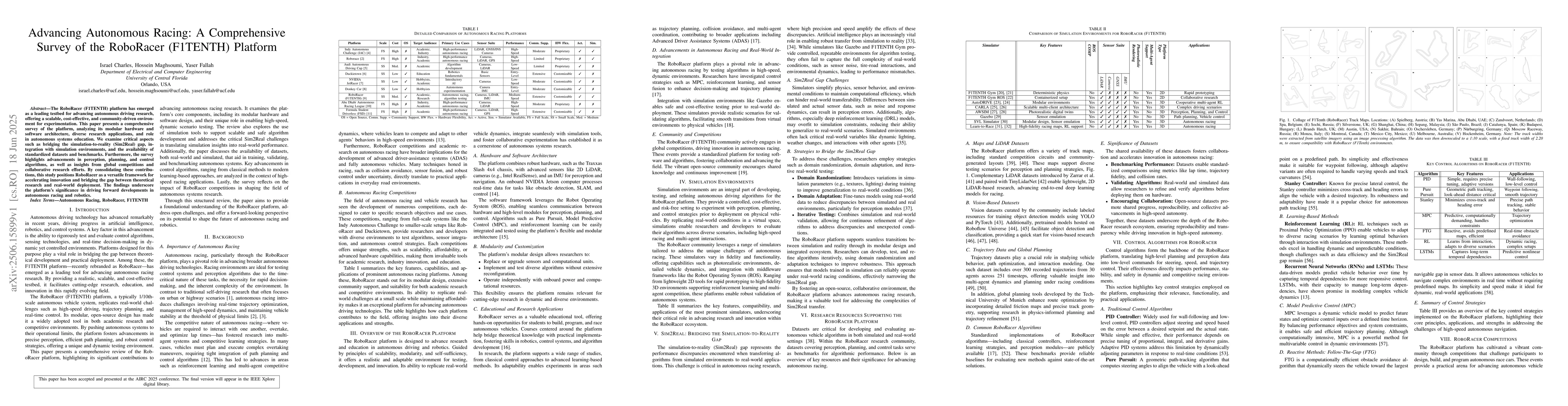 The RoboRacer (F1TENTH) platform has emerged as a leading testbed for advancing autonomous driving research, offering a scalable, cost-effective, and community-driven environment for experimentation. This paper presents a comprehensive survey of the platform, analyzing its modular hardware and software architecture, diverse research applications, and role in autonomous systems education. We examine critical aspects such as bridging the simulation-to-reality (Sim2Real) gap, integration with simulation environments, and the availability of standardized datasets and benchmarks. Furthermore, the survey highlights advancements in perception, planning, and control algorithms, as well as insights from global competitions and collaborative research efforts. By consolidating these contributions, this study positions RoboRacer as a versatile framework for accelerating innovation and bridging the gap between theoretical research and real-world deployment. The findings underscore the platform's significance in driving forward developments in autonomous racing and robotics.