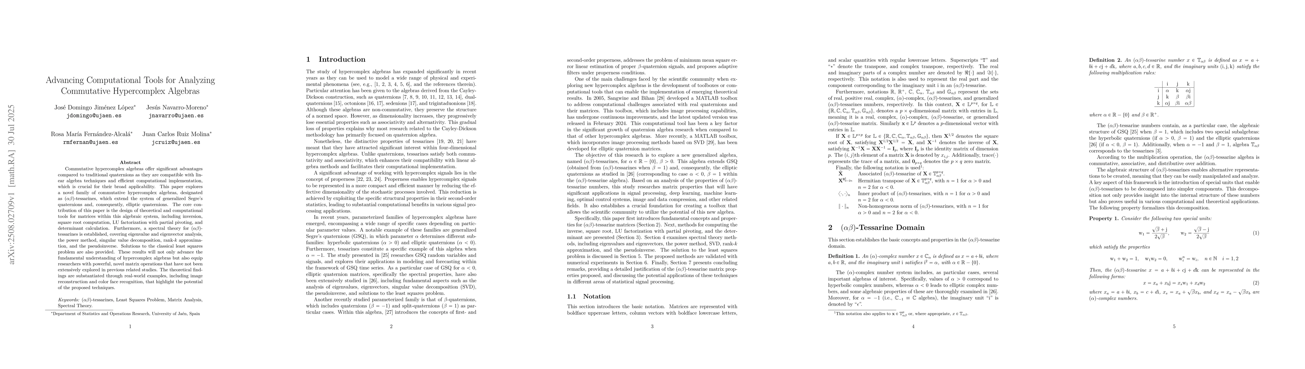 Commutative hypercomplex algebras offer significant advantages over traditional quaternions due to their compatibility with linear algebra techniques and efficient computational implementation, which is crucial for broad applicability. This paper explores a novel family of commutative hypercomplex algebras, referred to as (alpha,beta)-tessarines, which extend the system of generalized Segre's quaternions and, consequently, elliptic quaternions. The main contribution of this work is the development of theoretical and computational tools for matrices within this algebraic system, including inversion, square root computation, LU factorization with partial pivoting, and determinant calculation. Additionally, a spectral theory for (alpha,beta)-tessarines is established, covering eigenvalue and eigenvector analysis, the power method, singular value decomposition, rank-k approximation, and the pseudoinverse. Solutions to the classical least squares problem are also presented. These results not only enhance the fundamental understanding of hypercomplex algebras but also provide researchers with novel matrix operations that have not been extensively explored in previous studies. The theoretical findings are supported by real-world examples, including image reconstruction and color face recognition, which demonstrate the potential of the proposed techniques.