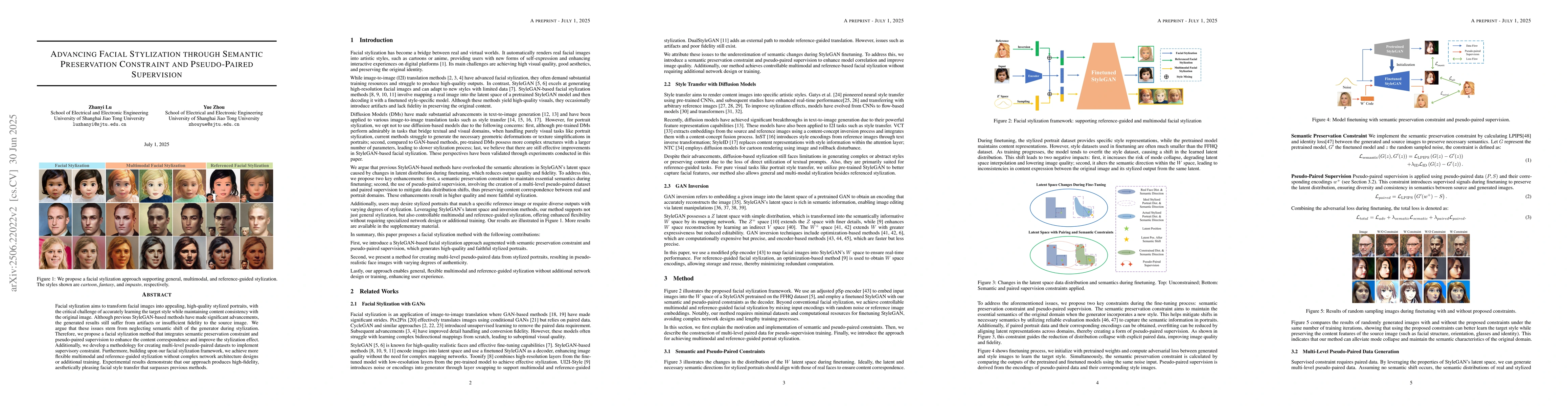 This paper proposes a facial stylization method that incorporates semantic preservation constraint and pseudo-paired supervision to improve content consistency in stylized portraits. The approach generates high-fidelity, visually appealing results surpassing previous methods, using a flexible framework for multimodal and reference-guided stylization without complex network modifications.