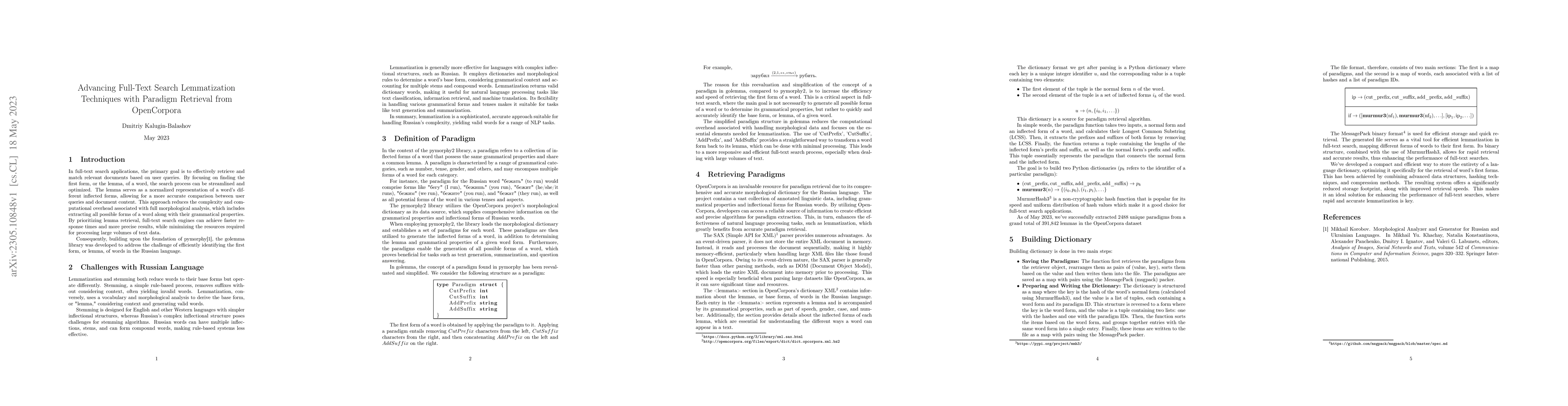This paper introduces an innovative method for enhancing full-text search lemmatization using the OpenCorpora dataset and a custom paradigm retrieval algorithm. It also proposes an efficient dictionary storage strategy to improve the speed and accuracy of lemma retrieval.