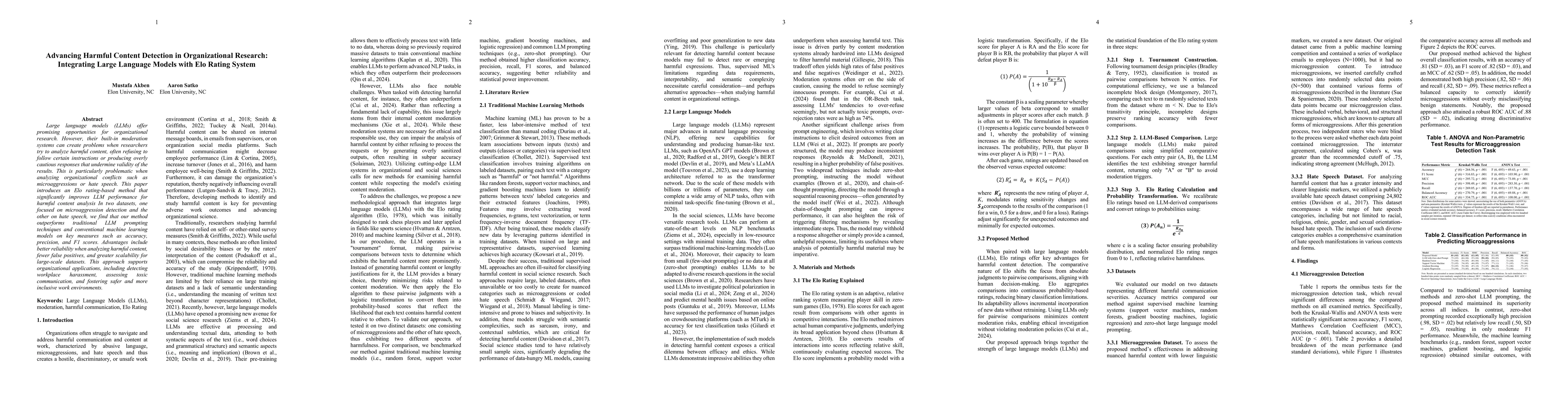 Large language models (LLMs) offer promising opportunities for organizational research. However, their built-in moderation systems can create problems when researchers try to analyze harmful content, often refusing to follow certain instructions or producing overly cautious responses that undermine validity of the results. This is particularly problematic when analyzing organizational conflicts such as microaggressions or hate speech. This paper introduces an Elo rating-based method that significantly improves LLM performance for harmful content analysis In two datasets, one focused on microaggression detection and the other on hate speech, we find that our method outperforms traditional LLM prompting techniques and conventional machine learning models on key measures such as accuracy, precision, and F1 scores. Advantages include better reliability when analyzing harmful content, fewer false positives, and greater scalability for large-scale datasets. This approach supports organizational applications, including detecting workplace harassment, assessing toxic communication, and fostering safer and more inclusive work environments.