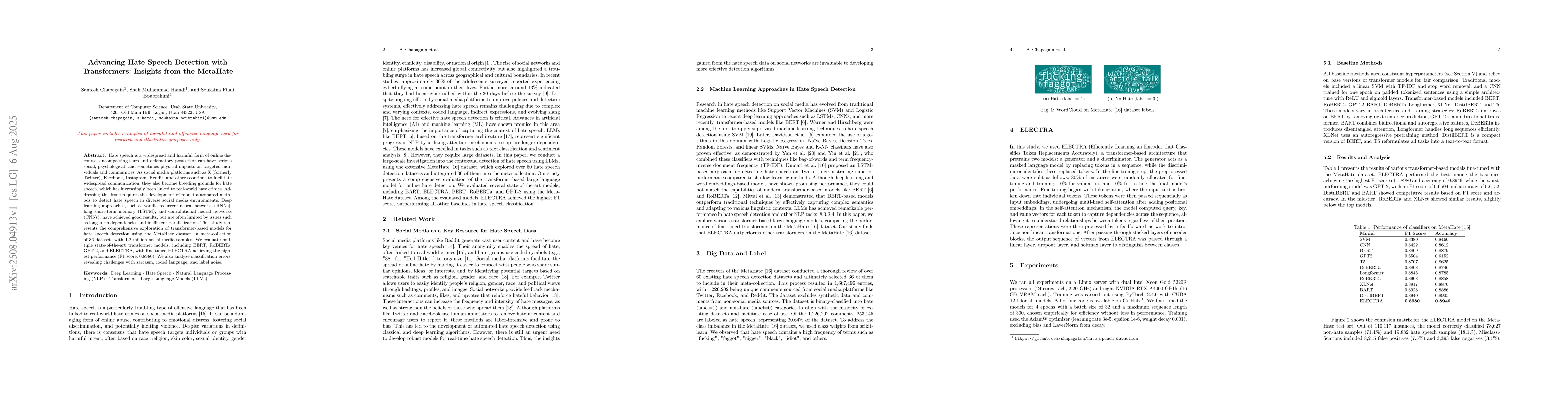Hate speech is a widespread and harmful form of online discourse, encompassing slurs and defamatory posts that can have serious social, psychological, and sometimes physical impacts on targeted individuals and communities. As social media platforms such as X (formerly Twitter), Facebook, Instagram, Reddit, and others continue to facilitate widespread communication, they also become breeding grounds for hate speech, which has increasingly been linked to real-world hate crimes. Addressing this issue requires the development of robust automated methods to detect hate speech in diverse social media environments. Deep learning approaches, such as vanilla recurrent neural networks (RNNs), long short-term memory (LSTM), and convolutional neural networks (CNNs), have achieved good results, but are often limited by issues such as long-term dependencies and inefficient parallelization. This study represents the comprehensive exploration of transformer-based models for hate speech detection using the MetaHate dataset--a meta-collection of 36 datasets with 1.2 million social media samples. We evaluate multiple state-of-the-art transformer models, including BERT, RoBERTa, GPT-2, and ELECTRA, with fine-tuned ELECTRA achieving the highest performance (F1 score: 0.8980). We also analyze classification errors, revealing challenges with sarcasm, coded language, and label noise.