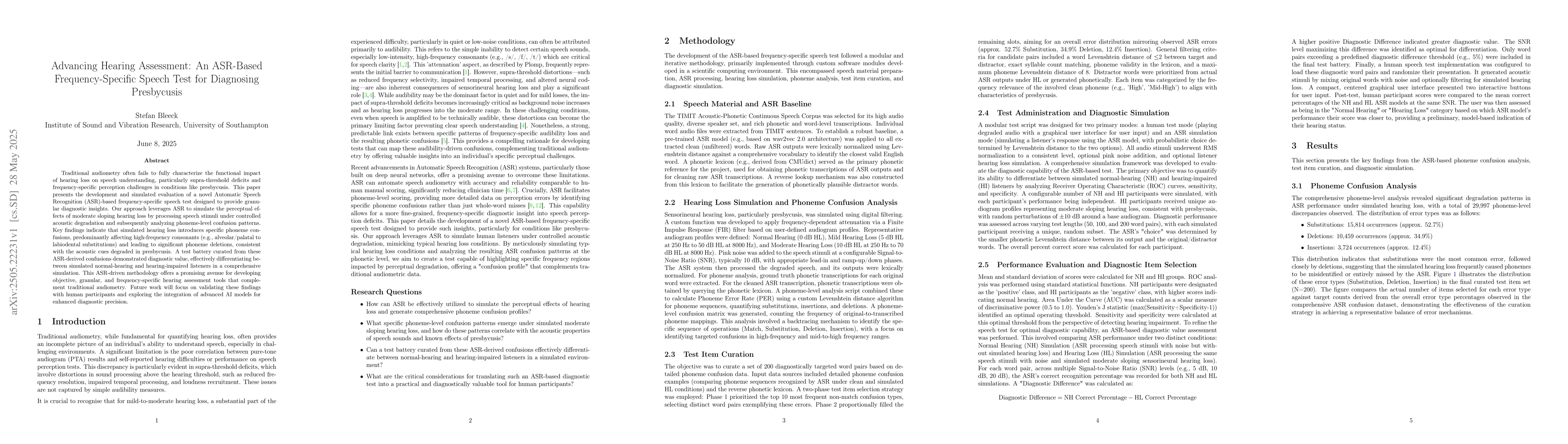 The research developed an ASR-based frequency-specific speech test using controlled acoustic degradation to simulate moderate sloping hearing loss, analyzing phoneme-level confusion patterns.