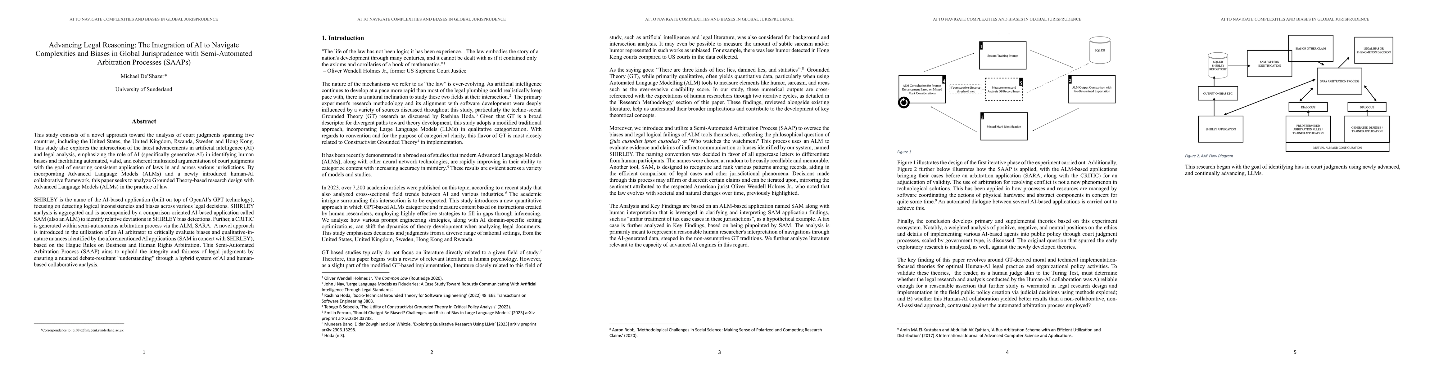 This study consists of a novel approach toward the analysis of court judgments spanning five countries, including the United States, the United Kingdom, Rwanda, Sweden and Hong Kong. This study also explores the intersection of the latest advancements in artificial intelligence (AI) and legal analysis, emphasizing the role of AI (specifically generative AI) in identifying human biases and facilitating automated, valid, and coherent multisided argumentation of court judgments with the goal of ensuring consistent application of laws in and across various jurisdictions. By incorporating Advanced Language Models (ALMs) and a newly introduced human-AI collaborative framework, this paper seeks to analyze Grounded Theory-based research design with Advanced Language Models (ALMs) in the practice of law. SHIRLEY is the name of the AI-based application (built on top of OpenAI's GPT technology), focusing on detecting logical inconsistencies and biases across various legal decisions. SHIRLEY analysis is aggregated and is accompanied by a comparison-oriented AI-based application called SAM (also an ALM) to identify relative deviations in SHIRLEY bias detections. Further, a CRITIC is generated within semi-autonomous arbitration process via the ALM, SARA. A novel approach is introduced in the utilization of an AI arbitrator to critically evaluate biases and qualitative-in-nature nuances identified by the aforementioned AI applications (SAM in concert with SHIRLEY), based on the Hague Rules on Business and Human Rights Arbitration. This Semi-Automated Arbitration Process (SAAP) aims to uphold the integrity and fairness of legal judgments by ensuring a nuanced debate-resultant "understanding" through a hybrid system of AI and human-based collaborative analysis.