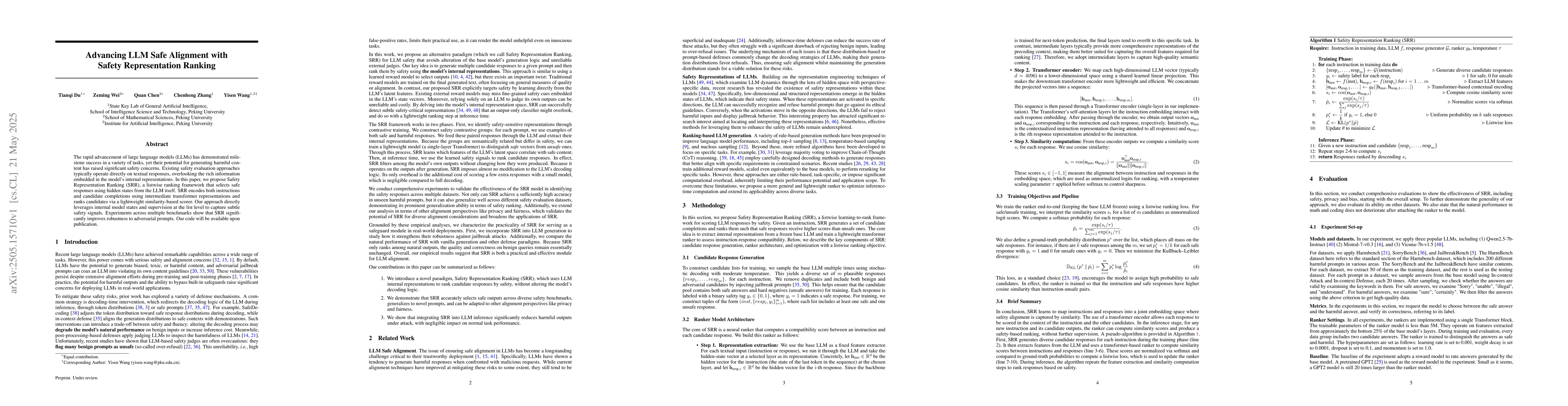 The paper proposes Safety Representation Ranking (SRR), a listwise ranking framework that uses hidden states from LLMs to select safe responses, encoding instructions and candidates via transformer representations and ranking them with a similarity-based scorer.