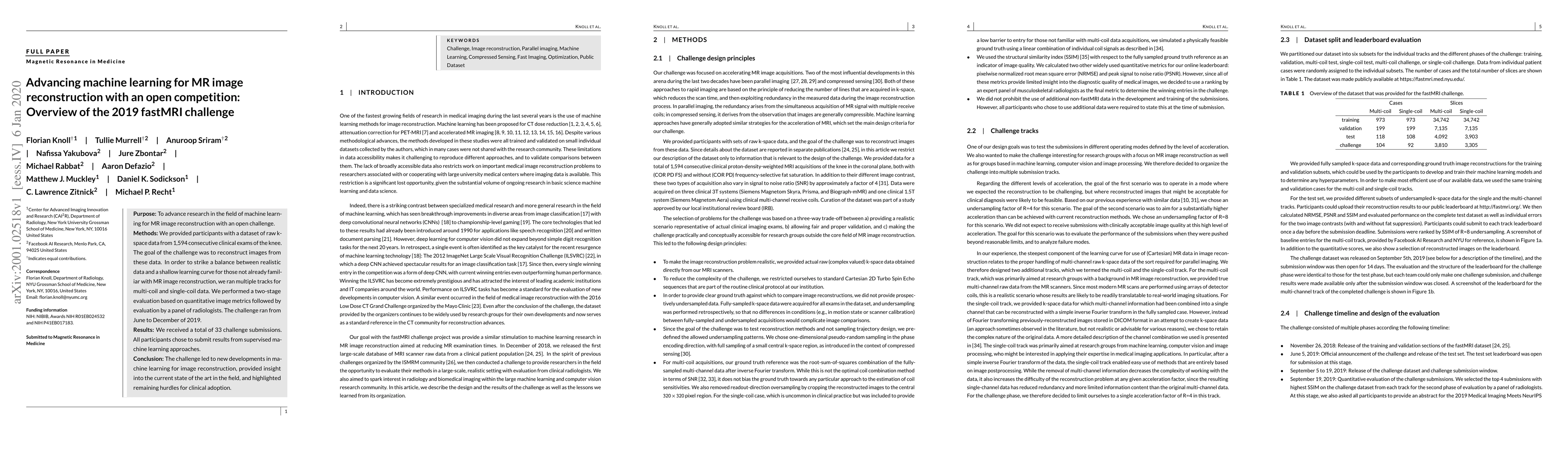 A machine learning competition was held to advance image reconstruction in MRI scans, with 33 submissions received from participants who used supervised machine learning approaches, leading to new developments and insights into the current state of the art in the field.