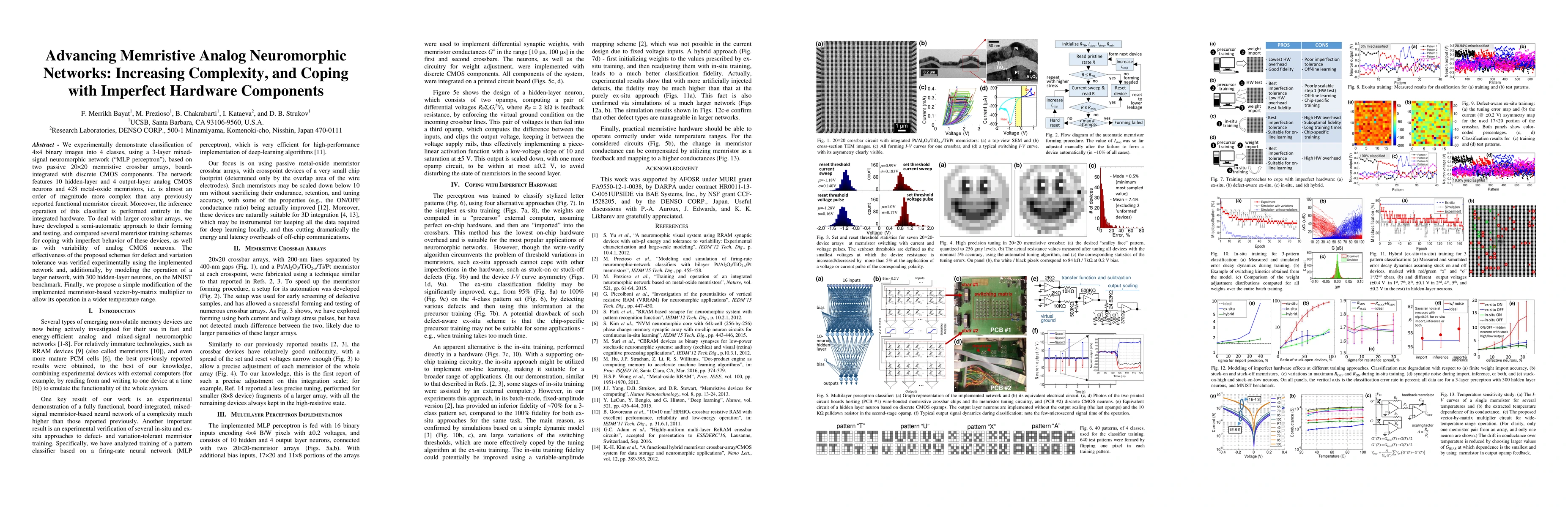 We experimentally demonstrate classification of 4x4 binary images into 4 classes, using a 3-layer mixed-signal neuromorphic network ("MLP perceptron"), based on two passive 20x20 memristive crossbar arrays, board-integrated with discrete CMOS components. The network features 10 hidden-layer and 4 output-layer analog CMOS neurons and 428 metal-oxide memristors, i.e. is almost an order of magnitude more complex than any previously reported functional memristor circuit. Moreover, the inference operation of this classifier is performed entirely in the integrated hardware. To deal with larger crossbar arrays, we have developed a semi-automatic approach to their forming and testing, and compared several memristor training schemes for coping with imperfect behavior of these devices, as well as with variability of analog CMOS neurons. The effectiveness of the proposed schemes for defect and variation tolerance was verified experimentally using the implemented network and, additionally, by modeling the operation of a larger network, with 300 hidden-layer neurons, on the MNIST benchmark. Finally, we propose a simple modification of the implemented memristor-based vector-by-matrix multiplier to allow its operation in a wider temperature range.