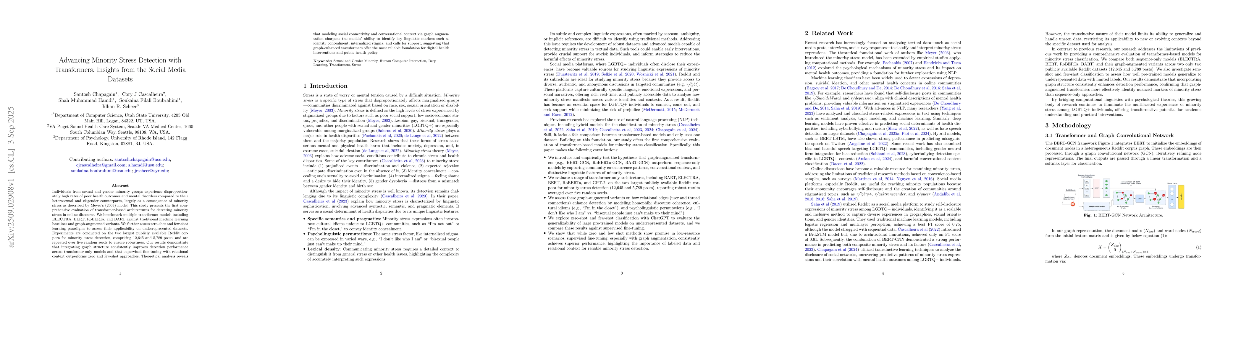 Individuals from sexual and gender minority groups experience disproportionately high rates of poor health outcomes and mental disorders compared to their heterosexual and cisgender counterparts, largely as a consequence of minority stress as described by Meyer's (2003) model. This study presents the first comprehensive evaluation of transformer-based architectures for detecting minority stress in online discourse. We benchmark multiple transformer models including ELECTRA, BERT, RoBERTa, and BART against traditional machine learning baselines and graph-augmented variants. We further assess zero-shot and few-shot learning paradigms to assess their applicability on underrepresented datasets. Experiments are conducted on the two largest publicly available Reddit corpora for minority stress detection, comprising 12,645 and 5,789 posts, and are repeated over five random seeds to ensure robustness. Our results demonstrate that integrating graph structure consistently improves detection performance across transformer-only models and that supervised fine-tuning with relational context outperforms zero and few-shot approaches. Theoretical analysis reveals that modeling social connectivity and conversational context via graph augmentation sharpens the models' ability to identify key linguistic markers such as identity concealment, internalized stigma, and calls for support, suggesting that graph-enhanced transformers offer the most reliable foundation for digital health interventions and public health policy.