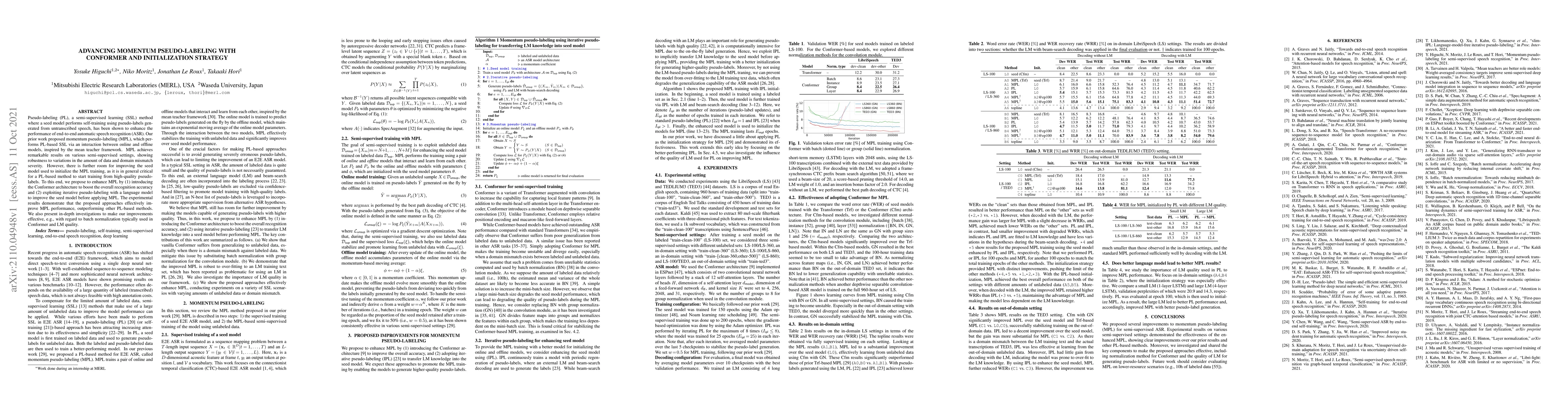 Pseudo-labeling (PL), a semi-supervised learning (SSL) method where a seed model performs self-training using pseudo-labels generated from untranscribed speech, has been shown to enhance the performance of end-to-end automatic speech recognition (ASR). Our prior work proposed momentum pseudo-labeling (MPL), which performs PL-based SSL via an interaction between online and offline models, inspired by the mean teacher framework. MPL achieves remarkable results on various semi-supervised settings, showing robustness to variations in the amount of data and domain mismatch severity. However, there is further room for improving the seed model used to initialize the MPL training, as it is in general critical for a PL-based method to start training from high-quality pseudo-labels. To this end, we propose to enhance MPL by (1) introducing the Conformer architecture to boost the overall recognition accuracy and (2) exploiting iterative pseudo-labeling with a language model to improve the seed model before applying MPL. The experimental results demonstrate that the proposed approaches effectively improve MPL performance, outperforming other PL-based methods. We also present in-depth investigations to make our improvements effective, e.g., with regard to batch normalization typically used in Conformer and LM quality.