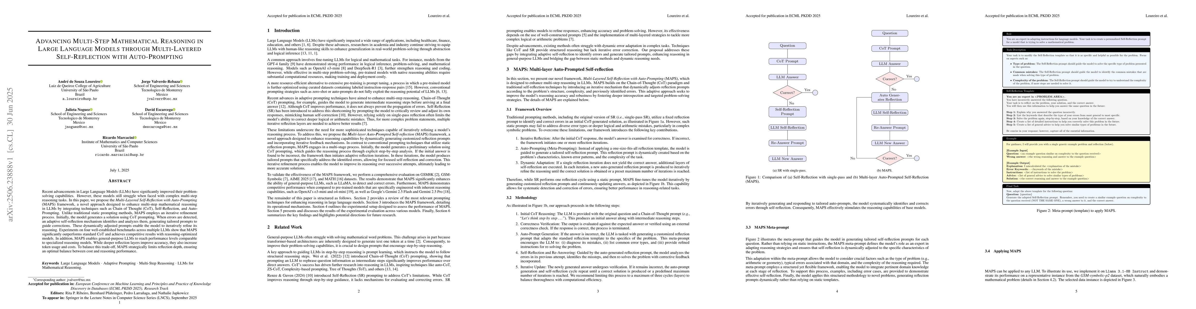 Recent advancements in Large Language Models (LLMs) have significantly improved their problem-solving capabilities. However, these models still struggle when faced with complex multi-step reasoning tasks. In this paper, we propose the Multi-Layered Self-Reflection with Auto-Prompting (MAPS) framework, a novel approach designed to enhance multi-step mathematical reasoning in LLMs by integrating techniques such as Chain of Thought (CoT), Self-Reflection, and Auto-Prompting. Unlike traditional static prompting methods, MAPS employs an iterative refinement process. Initially, the model generates a solution using CoT prompting. When errors are detected, an adaptive self-reflection mechanism identifies and analyzes them, generating tailored prompts to guide corrections. These dynamically adjusted prompts enable the model to iteratively refine its reasoning. Experiments on four well-established benchmarks across multiple LLMs show that MAPS significantly outperforms standard CoT and achieves competitive results with reasoning-optimized models. In addition, MAPS enables general-purpose LLMs to reach performance levels comparable to specialized reasoning models. While deeper reflection layers improve accuracy, they also increase token usage and costs. To balance this trade-off, MAPS strategically limits reflection depth, ensuring an optimal balance between cost and reasoning performance.