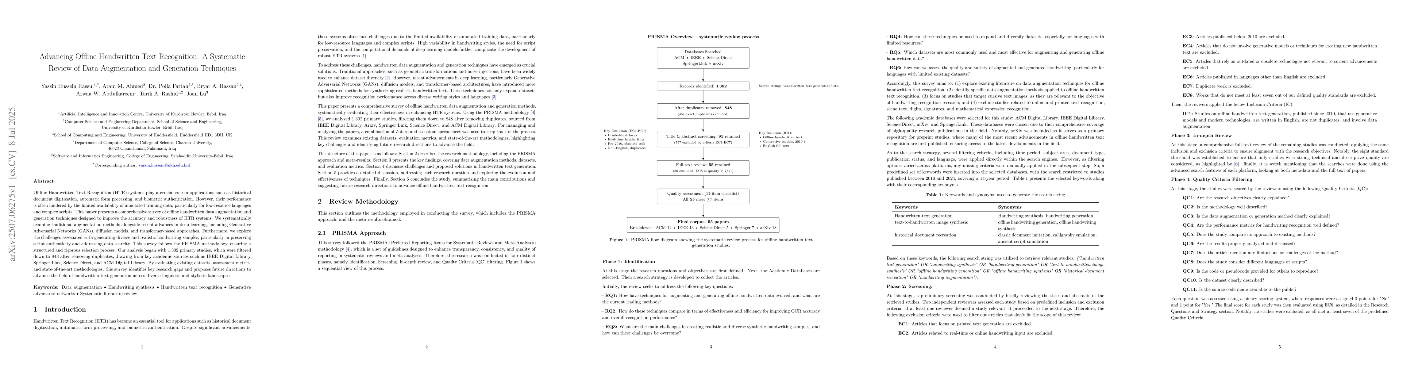Offline Handwritten Text Recognition (HTR) systems play a crucial role in applications such as historical document digitization, automatic form processing, and biometric authentication. However, their performance is often hindered by the limited availability of annotated training data, particularly for low-resource languages and complex scripts. This paper presents a comprehensive survey of offline handwritten data augmentation and generation techniques designed to improve the accuracy and robustness of HTR systems. We systematically examine traditional augmentation methods alongside recent advances in deep learning, including Generative Adversarial Networks (GANs), diffusion models, and transformer-based approaches. Furthermore, we explore the challenges associated with generating diverse and realistic handwriting samples, particularly in preserving script authenticity and addressing data scarcity. This survey follows the PRISMA methodology, ensuring a structured and rigorous selection process. Our analysis began with 1,302 primary studies, which were filtered down to 848 after removing duplicates, drawing from key academic sources such as IEEE Digital Library, Springer Link, Science Direct, and ACM Digital Library. By evaluating existing datasets, assessment metrics, and state-of-the-art methodologies, this survey identifies key research gaps and proposes future directions to advance the field of handwritten text generation across diverse linguistic and stylistic landscapes.
