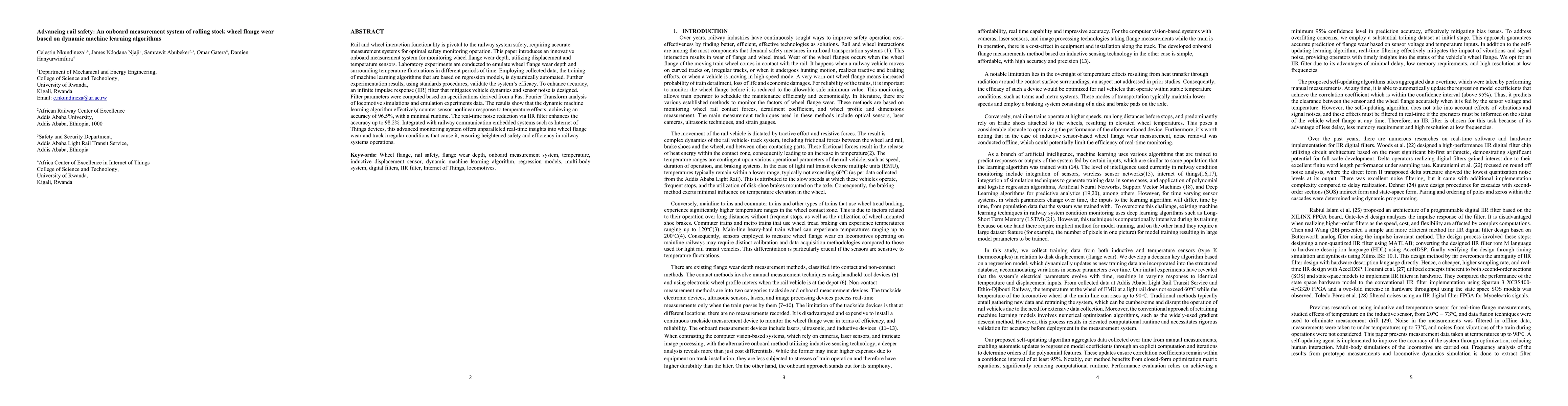 Rail and wheel interaction functionality is pivotal to the railway system safety, requiring accurate measurement systems for optimal safety monitoring operation. This paper introduces an innovative onboard measurement system for monitoring wheel flange wear depth, utilizing displacement and temperature sensors. Laboratory experiments are conducted to emulate wheel flange wear depth and surrounding temperature fluctuations in different periods of time. Employing collected data, the training of machine learning algorithms that are based on regression models, is dynamically automated. Further experimentation results, using standards procedures, validate the system's efficacy. To enhance accuracy, an infinite impulse response filter (IIR) that mitigates vehicle dynamics and sensor noise is designed. Filter parameters were computed based on specifications derived from a Fast Fourier Transform analysis of locomotive simulations and emulation experiments data. The results show that the dynamic machine learning algorithm effectively counter sensor nonlinear response to temperature effects, achieving an accuracy of 96.5 %, with a minimal runtime. The real-time noise reduction via IIR filter enhances the accuracy up to 98.2 %. Integrated with railway communication embedded systems such as Internet of Things devices, this advanced monitoring system offers unparalleled real-time insights into wheel flange wear and track irregular conditions that cause it, ensuring heightened safety and efficiency in railway systems operations.