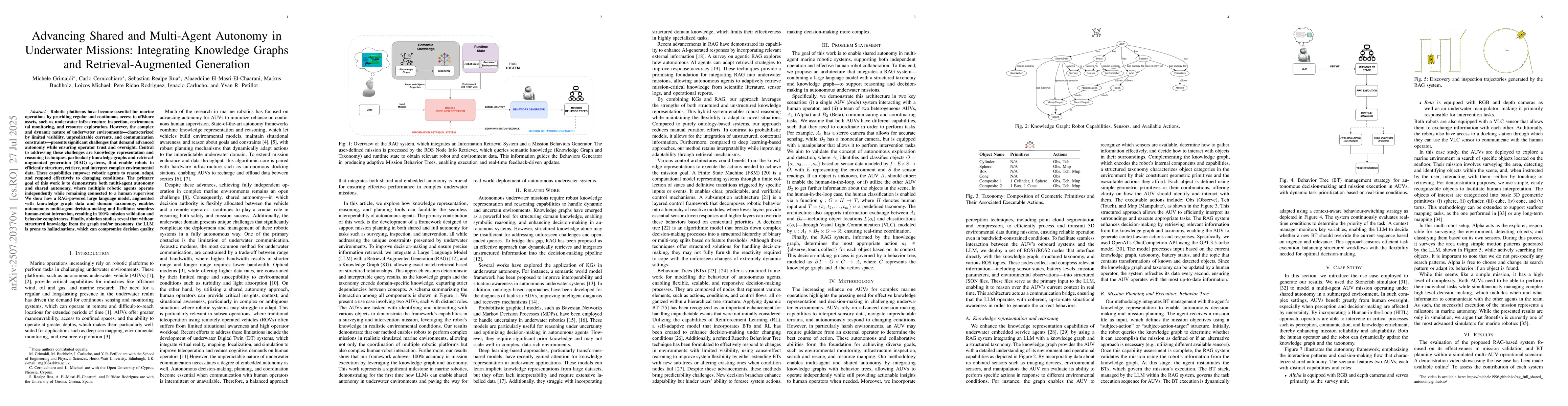 This research advances underwater mission autonomy by integrating knowledge graphs and retrieval-augmented generation (RAG) systems. The methodology employs a RAG-powered language model, enhancing multi-agent and shared autonomy, ensuring 100% mission success and completeness, while ablation studies show reduced performance without structured knowledge.
