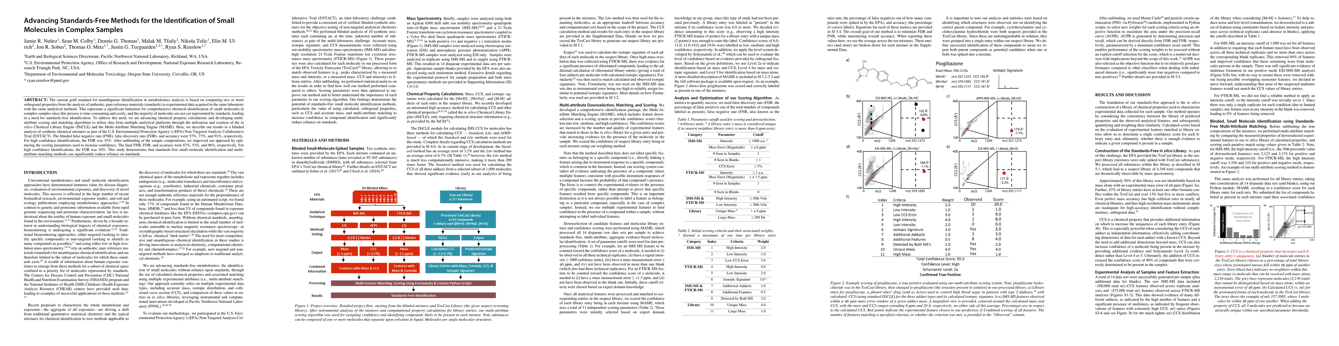 This paper introduces advanced standards-free methods for identifying small molecules in complex samples, utilizing computational tools like the in silico Chemical Library Engine (ISiCLE) and Multi-Attribute Matching Engine (MAME). Initial results showed a 57% false negative rate and a 77% false discovery rate, which improved to a 67% false negative rate and a 53% false discovery rate after optimization, demonstrating the potential of these methods to reduce reliance on costly and time-consuming standards.