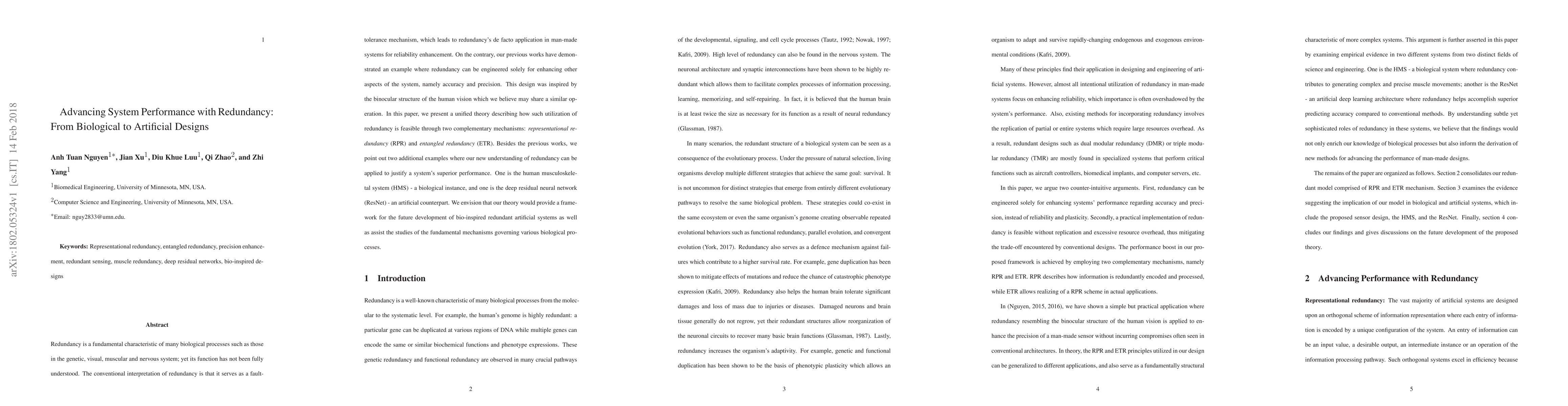 Redundancy is a fundamental characteristic of many biological processes such as those in the genetic, visual, muscular and nervous system; yet its function has not been fully understood. The conventional interpretation of redundancy is that it serves as a fault-tolerance mechanism, which leads to redundancy's de facto application in man-made systems for reliability enhancement. On the contrary, our previous works have demonstrated an example where redundancy can be engineered solely for enhancing other aspects of the system, namely accuracy and precision. This design was inspired by the binocular structure of the human vision which we believe may share a similar operation. In this paper, we present a unified theory describing how such utilization of redundancy is feasible through two complementary mechanisms: representational redundancy (RPR) and entangled redundancy (ETR). Besides the previous works, we point out two additional examples where our new understanding of redundancy can be applied to justify a system's superior performance. One is the human musculoskeletal system (HMS) - a biological instance, and one is the deep residual neural network (ResNet) - an artificial counterpart. We envision that our theory would provide a framework for the future development of bio-inspired redundant artificial systems as well as assist the studies of the fundamental mechanisms governing various biological processes.
