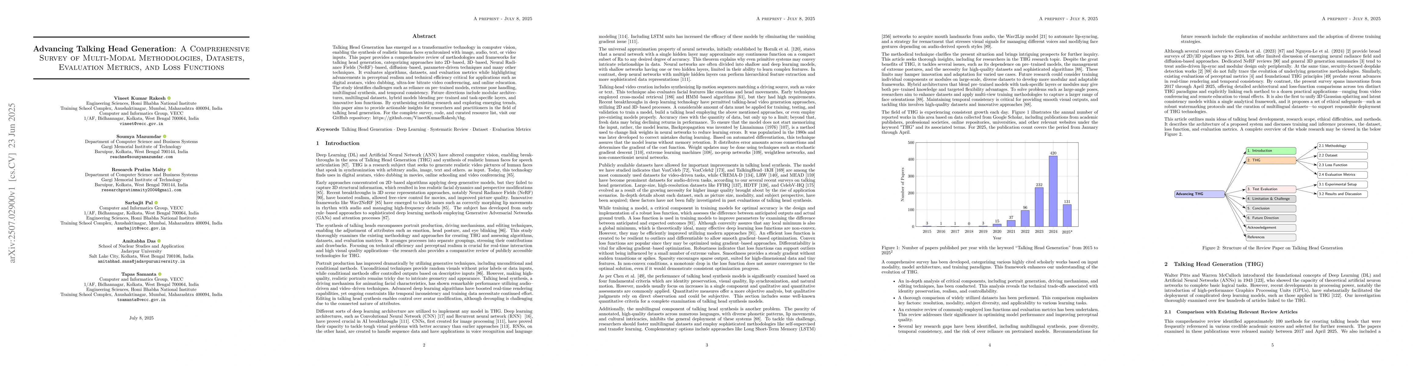 Talking Head Generation (THG) has emerged as a transformative technology in computer vision, enabling the synthesis of realistic human faces synchronized with image, audio, text, or video inputs. This paper provides a comprehensive review of methodologies and frameworks for talking head generation, categorizing approaches into 2D--based, 3D--based, Neural Radiance Fields (NeRF)--based, diffusion--based, parameter-driven techniques and many other techniques. It evaluates algorithms, datasets, and evaluation metrics while highlighting advancements in perceptual realism and technical efficiency critical for applications such as digital avatars, video dubbing, ultra-low bitrate video conferencing, and online education. The study identifies challenges such as reliance on pre--trained models, extreme pose handling, multilingual synthesis, and temporal consistency. Future directions include modular architectures, multilingual datasets, hybrid models blending pre--trained and task-specific layers, and innovative loss functions. By synthesizing existing research and exploring emerging trends, this paper aims to provide actionable insights for researchers and practitioners in the field of talking head generation. For the complete survey, code, and curated resource list, visit our GitHub repository: https://github.com/VineetKumarRakesh/thg.