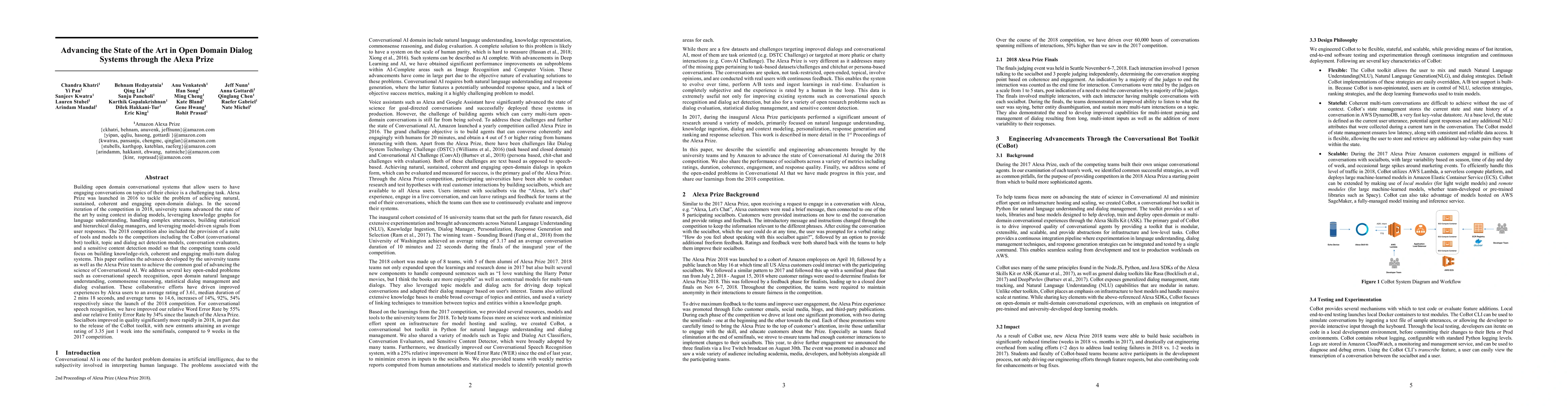 This paper details the advancements in open domain dialog systems achieved through the 2018 Alexa Prize competition, highlighting improvements in context modeling, knowledge graphs, and dialog management, and reporting significant enhancements in conversational speech recognition and overall user interaction metrics.