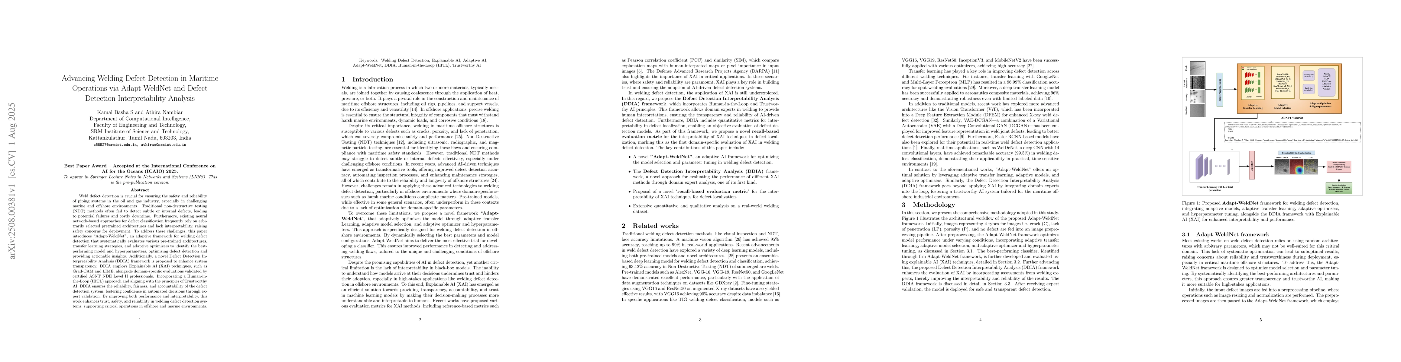 Weld defect detection is crucial for ensuring the safety and reliability of piping systems in the oil and gas industry, especially in challenging marine and offshore environments. Traditional non-destructive testing (NDT) methods often fail to detect subtle or internal defects, leading to potential failures and costly downtime. Furthermore, existing neural network-based approaches for defect classification frequently rely on arbitrarily selected pretrained architectures and lack interpretability, raising safety concerns for deployment. To address these challenges, this paper introduces ``Adapt-WeldNet", an adaptive framework for welding defect detection that systematically evaluates various pre-trained architectures, transfer learning strategies, and adaptive optimizers to identify the best-performing model and hyperparameters, optimizing defect detection and providing actionable insights. Additionally, a novel Defect Detection Interpretability Analysis (DDIA) framework is proposed to enhance system transparency. DDIA employs Explainable AI (XAI) techniques, such as Grad-CAM and LIME, alongside domain-specific evaluations validated by certified ASNT NDE Level II professionals. Incorporating a Human-in-the-Loop (HITL) approach and aligning with the principles of Trustworthy AI, DDIA ensures the reliability, fairness, and accountability of the defect detection system, fostering confidence in automated decisions through expert validation. By improving both performance and interpretability, this work enhances trust, safety, and reliability in welding defect detection systems, supporting critical operations in offshore and marine environments.