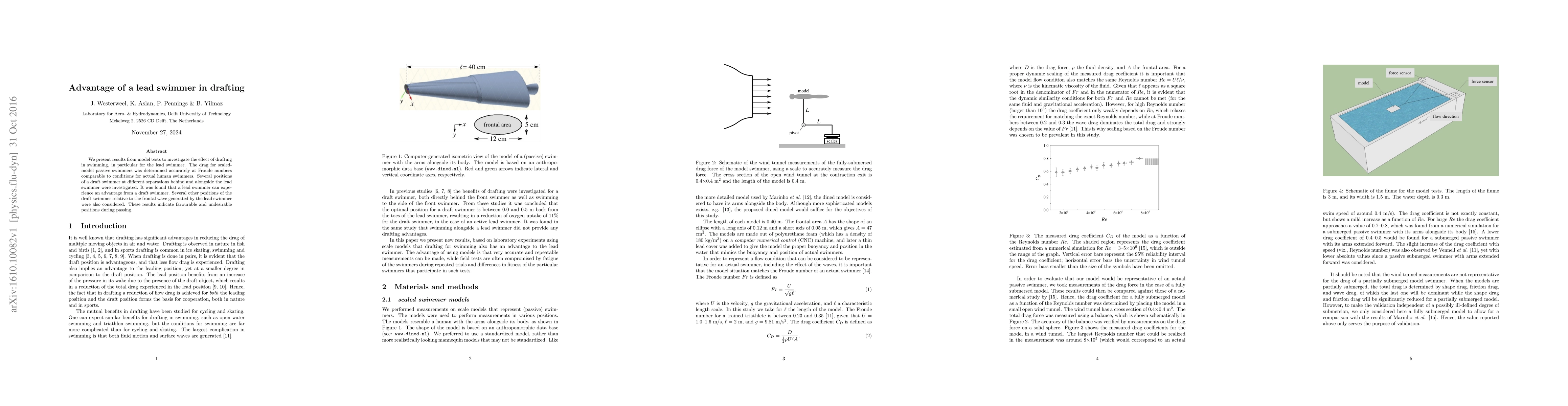 We present results from model tests to investigate the effect of drafting in swimming, in particular for the lead swimmer. The drag for scaled-model passive swimmers was determined accurately at Froude numbers comparable to conditions for actual human swimmers. Several positions of a draft swimmer at different separations behind and alongside the lead swimmer were investigated. It was found that a lead swimmer can experience an advantage from a draft swimmer. Several other positions of the draft swimmer relative to the frontal wave generated by the lead swimmer were also considered. These results indicate favourable and undesirable positions during passing.