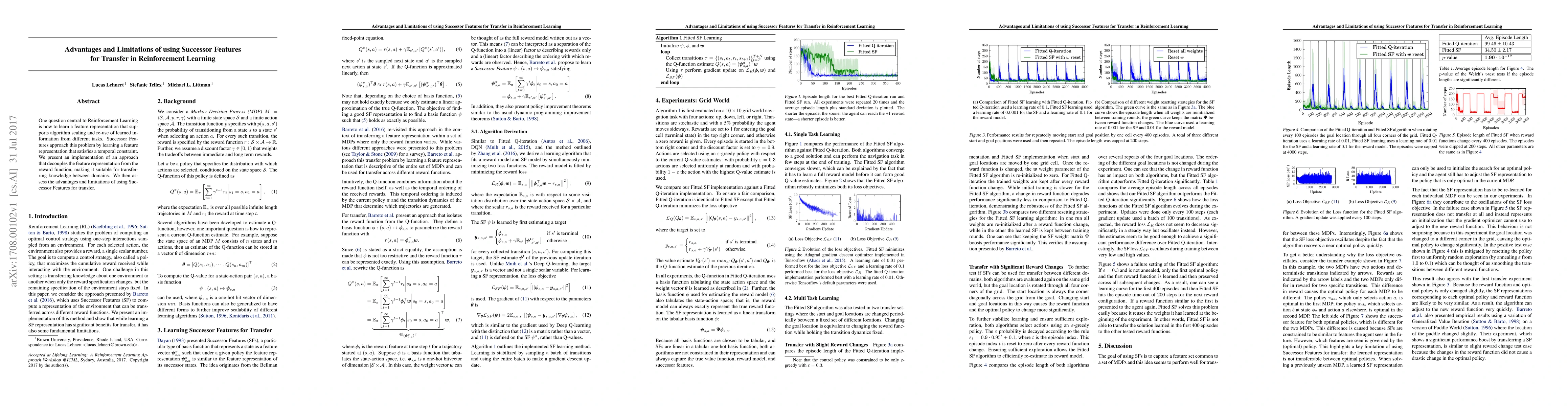This paper explores the advantages and limitations of using Successor Features for transfer in reinforcement learning, demonstrating a method that decouples feature representation from the reward function to facilitate knowledge transfer across different domains. The study highlights both the benefits and challenges of this approach in scaling and reusing learned information.