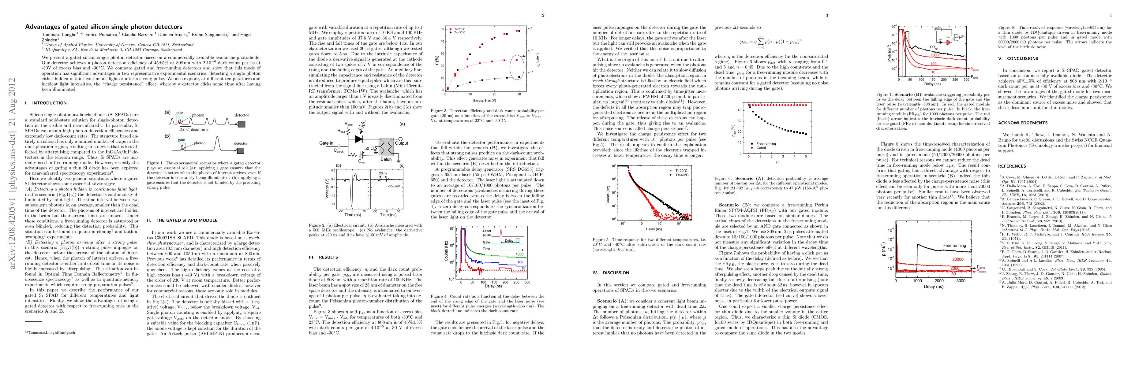 This paper introduces a gated silicon single photon detector with 45%±5% efficiency at 808 nm, demonstrating significant advantages over free-running detectors in scenarios involving faint light or strong pulses. The study also investigates the "charge persistence" effect under varying temperatures and light intensities.