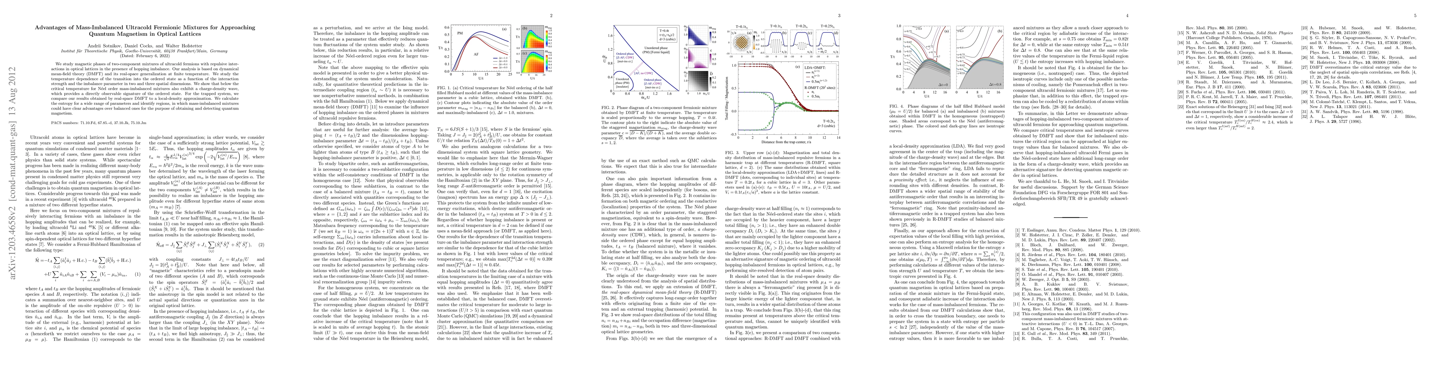 We study magnetic phases of two-component mixtures of ultracold fermions with repulsive interactions in optical lattices in the presence of hopping imbalance. Our analysis is based on dynamical mean-field theory (DMFT) and its real-space generalization at finite temperature. We study the temperature dependence of the transition into the ordered state as a function of the interaction strength and the imbalance parameter in two and three spatial dimensions. We show that below the critical temperature for N\'{e}el order mass-imbalanced mixtures also exhibit a charge-density wave, which provides a directly observable signature of the ordered state. For the trapped system, we compare our results obtained by real-space DMFT to a local-density approximation. We calculate the entropy for a wide range of parameters and identify regions, in which mass-imbalanced mixtures could have clear advantages over balanced ones for the purpose of obtaining and detecting quantum magnetism.