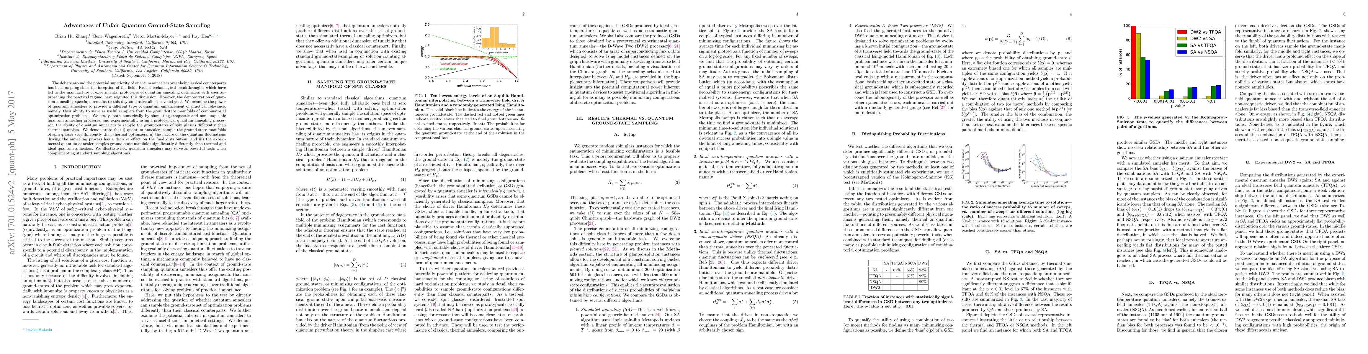 The debate around the potential superiority of quantum annealers over their classical counterparts has been ongoing since the inception of the field by Kadowaki and Nishimori close to two decades ago. Recent technological breakthroughs in the field, which have led to the manufacture of experimental prototypes of quantum annealing optimizers with sizes approaching the practical regime, have reignited this discussion. However, the demonstration of quantum annealing speedups remains to this day an elusive albeit coveted goal. Here, we examine the power of quantum annealers to provide a different type of quantum enhancement of practical relevance, namely, their ability to serve as useful samplers from the ground-state manifolds of combinatorial optimization problems. We study, both numerically by simulating ideal stoquastic and non-stoquastic quantum annealing processes, and experimentally, using a commercially available quantum annealing processor, the ability of quantum annealers to sample the ground-states of spin glasses differently than classical thermal samplers. We demonstrate that i) quantum annealers in general sample the ground-state manifolds of spin glasses very differently than thermal optimizers, ii) the nature of the quantum fluctuations driving the annealing process has a decisive effect on the final distribution over ground-states, and iii) the experimental quantum annealer samples ground-state manifolds significantly differently than thermal and ideal quantum annealers. We illustrate how quantum annealers may serve as powerful tools when complementing standard sampling algorithms.