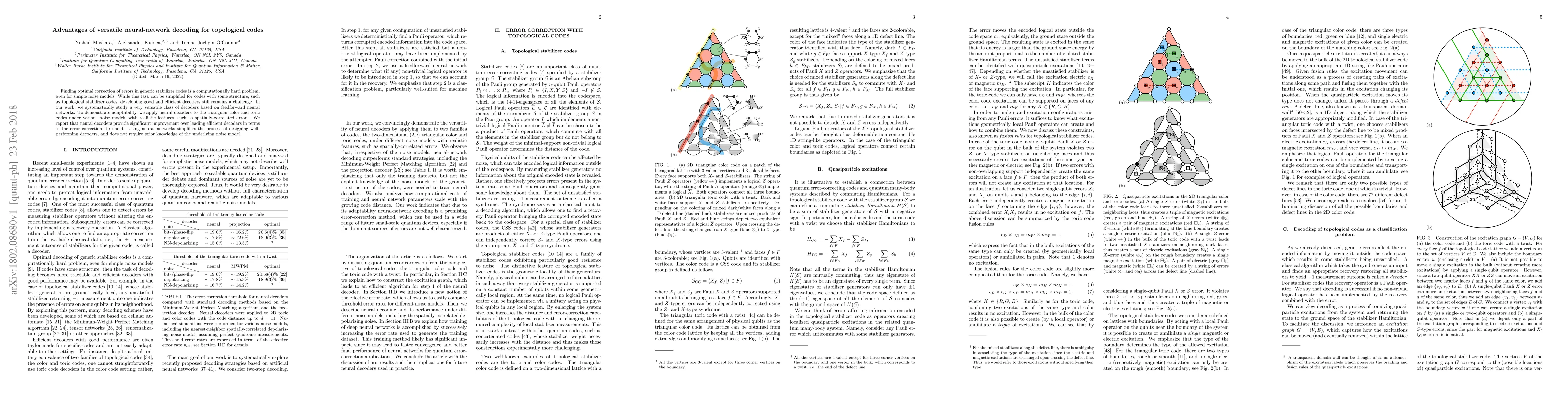 This research explores the advantages of using feedforward neural networks for decoding topological stabilizer codes, demonstrating significant improvements in error-correction thresholds compared to traditional decoders. Neural decoders show adaptability to various noise models without requiring prior knowledge of the noise characteristics.