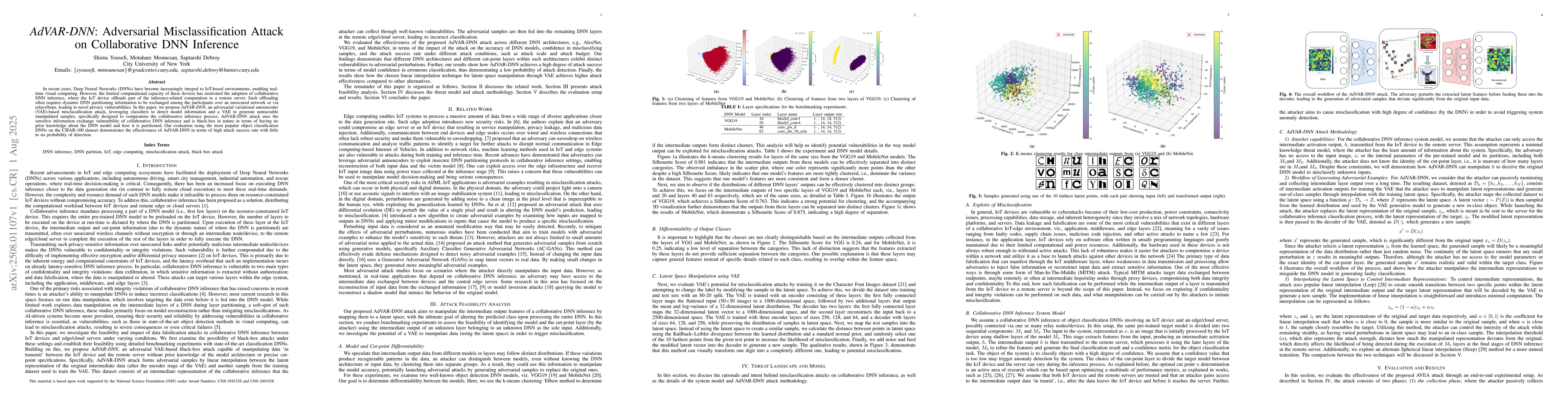 In recent years, Deep Neural Networks (DNNs) have become increasingly integral to IoT-based environments, enabling realtime visual computing. However, the limited computational capacity of these devices has motivated the adoption of collaborative DNN inference, where the IoT device offloads part of the inference-related computation to a remote server. Such offloading often requires dynamic DNN partitioning information to be exchanged among the participants over an unsecured network or via relays/hops, leading to novel privacy vulnerabilities. In this paper, we propose AdVAR-DNN, an adversarial variational autoencoder (VAE)-based misclassification attack, leveraging classifiers to detect model information and a VAE to generate untraceable manipulated samples, specifically designed to compromise the collaborative inference process. AdVAR-DNN attack uses the sensitive information exchange vulnerability of collaborative DNN inference and is black-box in nature in terms of having no prior knowledge about the DNN model and how it is partitioned. Our evaluation using the most popular object classification DNNs on the CIFAR-100 dataset demonstrates the effectiveness of AdVAR-DNN in terms of high attack success rate with little to no probability of detection.