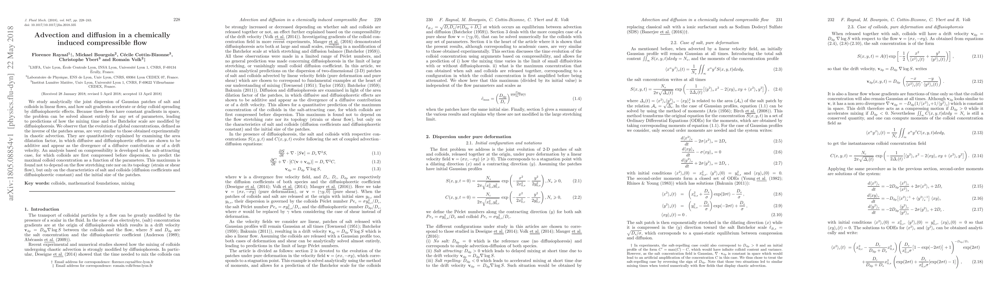 We study analytically the joint dispersion of Gaussian patches of salt and colloids in linear flows, and how salt gradients accelerate or delay colloid spreading by diffusiophoretic effects. Because these flows have constant gradients in space, the problem can be solved almost entirely for any set of parameters, leading to predictions of how the mixing time and the Batchelor scale are modified by diffusiophoresis. We observe that the evolution of global concentrations, defined as the inverse of the patches areas, are very similar to those obtained experimentally in chaotic advection. They are quantitatively explained by examining the area dilatation factor, in which diffusive and diffusiophoretic effects are shown to be additive and appear as the divergence of a diffusive contribution or of a drift velocity. An analysis based on compressibility is developed in the salt-attracting case, for which colloids are first compressed before dispersion, to predict the maximal colloid concentration as a function of the parameters. This maximum is found not to depend on the flow stretching rate nor on its topology (strain or shear flow), but only on the characteristics of salt and colloids (diffusion coefficients and diffusiophoretic constant) and the initial size of the patches.