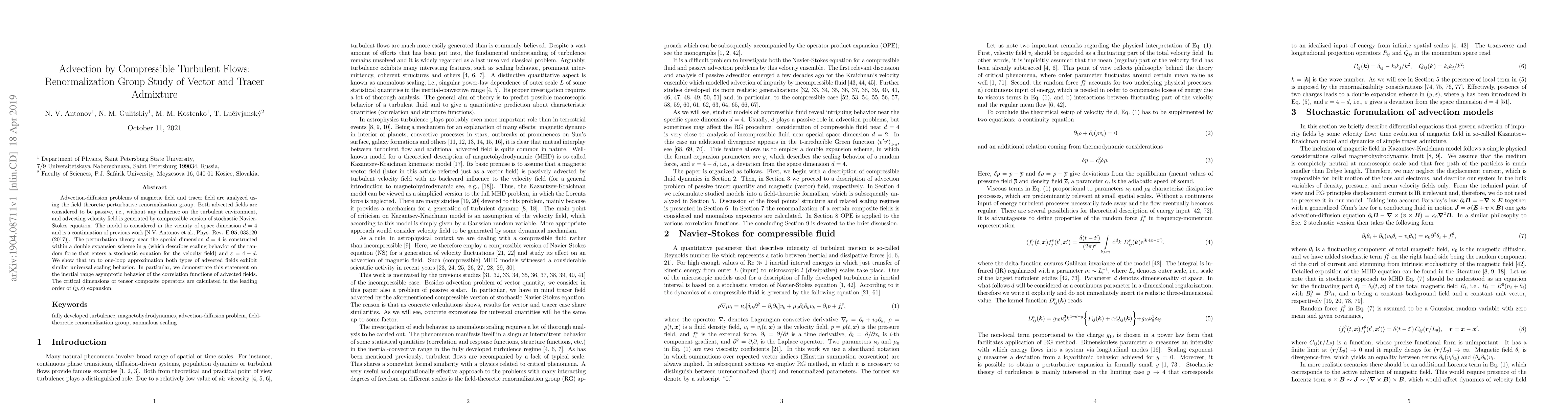 This paper uses renormalization group theory to study the advection of magnetic and tracer fields by compressible turbulent flows, focusing on the universal scaling behavior near the critical dimension $d=4$. The analysis reveals similar inertial range asymptotic behavior for both advected fields up to one-loop approximation.