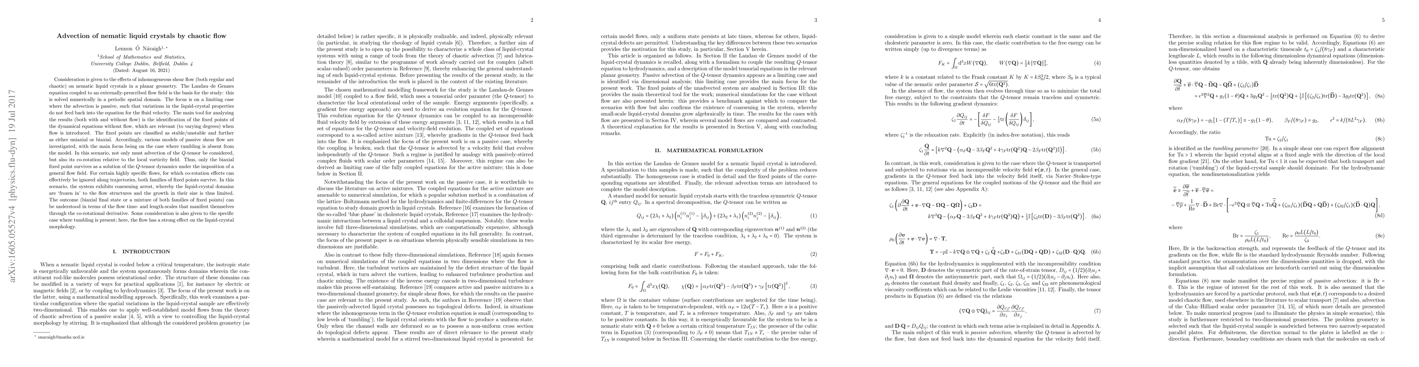 Consideration is given to the effects of inhomogeneous shear flow (both regular and chaotic) on nematic liquid crystals in a planar geometry. The Landau--de Gennes equation coupled to an externally-prescribed flow field is the basis for the study: this is solved numerically in a periodic spatial domain. The focus is on a limiting case where the advection is passive, such that variations in the liquid-crystal properties do not feed back into the equation for the fluid velocity. The main tool for analyzing the results (both with and without flow) is the identification of the fixed points of the dynamical equations without flow, which are relevant (to varying degrees) when flow is introduced. The fixed points are classified as stable/unstable and further as either uniaxial or biaxial. Accordingly, various models of passive shear flow are investigated, with the main focus being on the case where tumbling is absent from the model. In this scenario, not only must advection of the $Q$-tensor be considered, but also its co-rotation relative to the local vorticity field. Thus, only the biaxial fixed point survives as a solution of the $Q$-tensor dynamics under the imposition of a general flow field. For certain flows for which co-rotation effects can effectively be ignored along trajectories, both families of fixed points survive. In this scenario, the system exhibits coarsening arrest, whereby the liquid-crystal domains are `frozen in' to the flow structures and the growth in their size is thus limited. The outcome (biaxial final state or a mixture of both families of fixed points) can be understood in terms of the flow time- and length-scales that manifest themselves through the co-rotational derivative. Some consideration is also given to the specific case where tumbling is present; here, the flow has a strong effect on the liquid-crystal morphology.